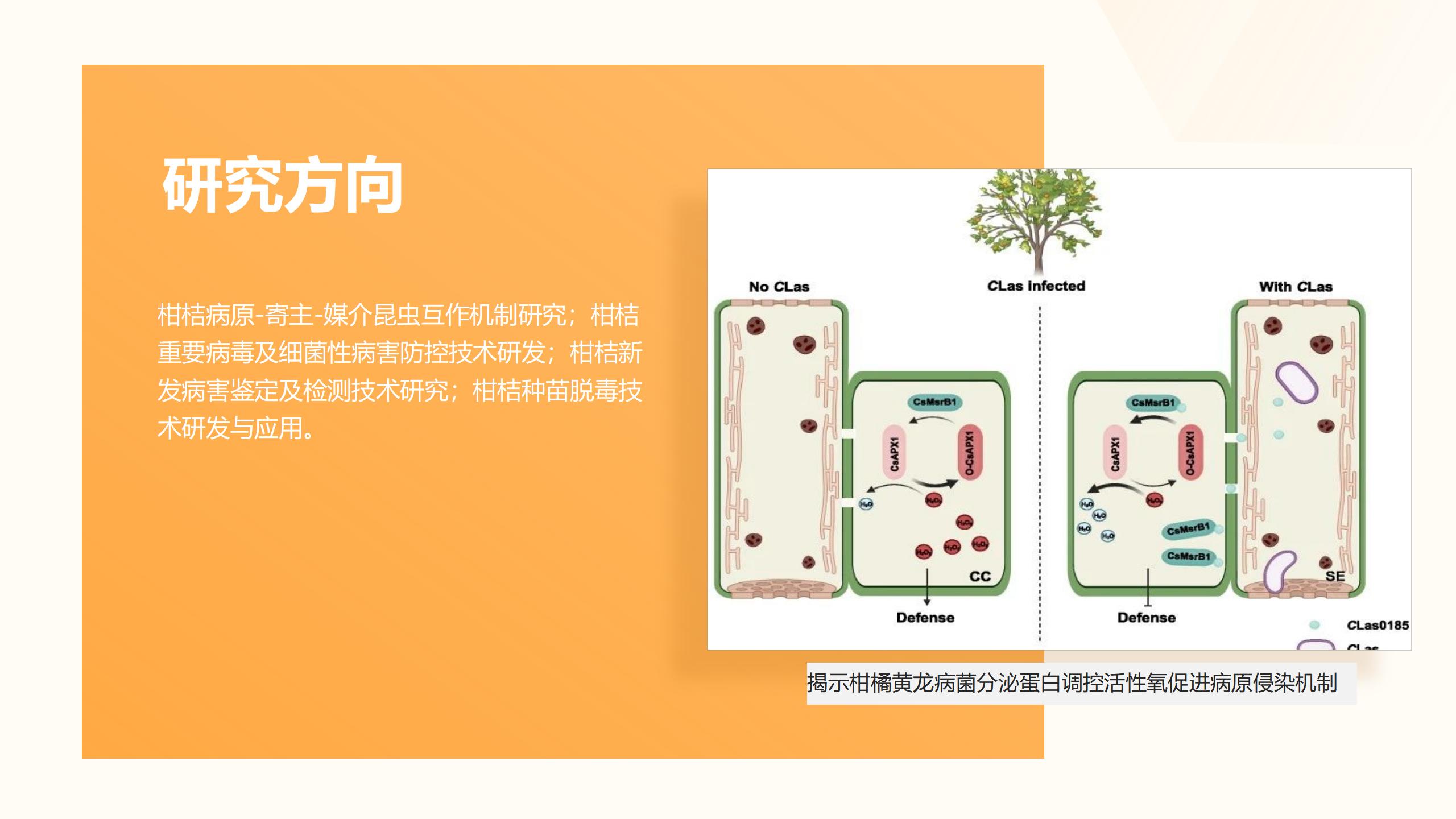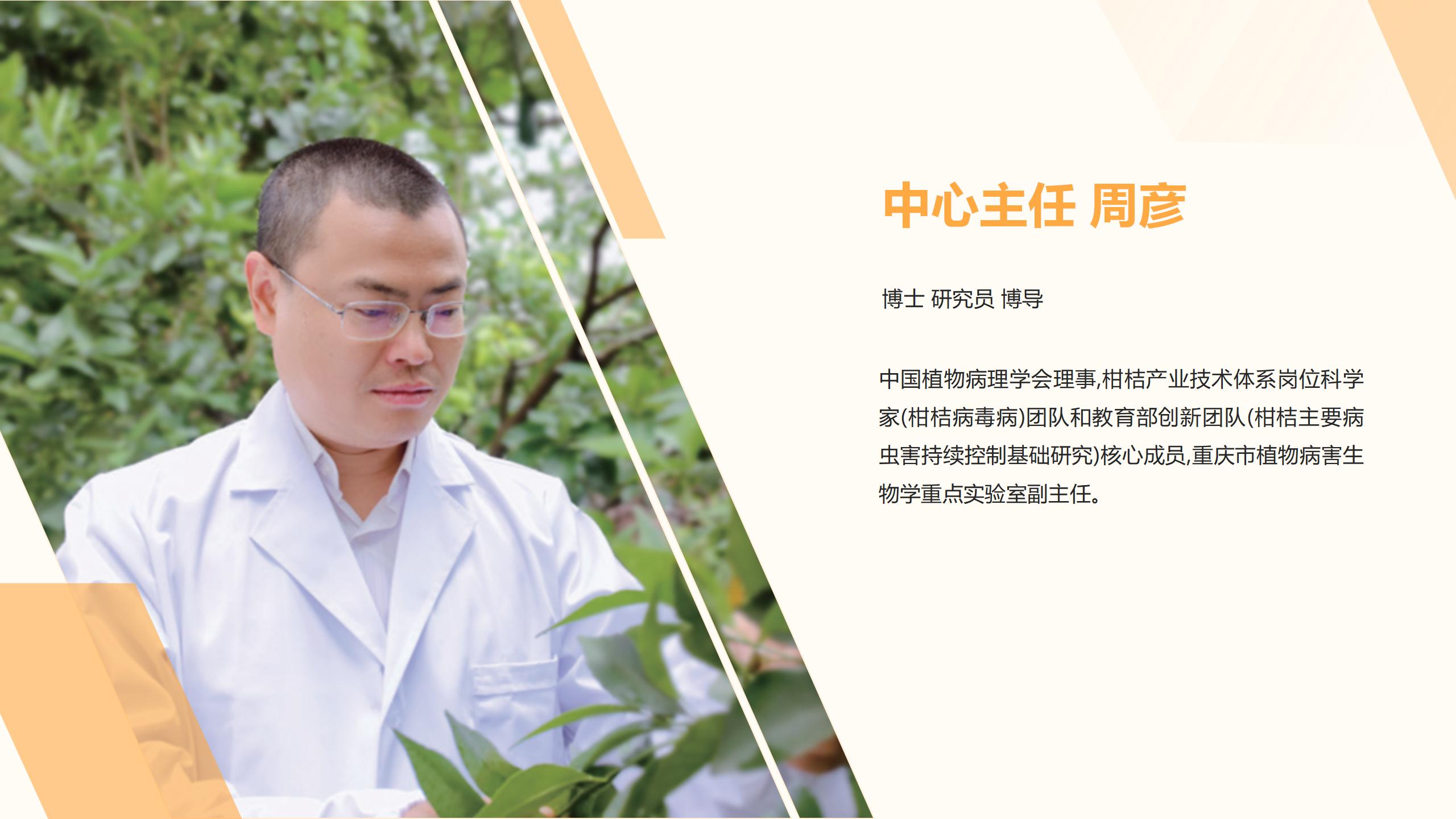 团队现有科技人员14人,其中国家级人才2人,高级职称12人。在中心首席专家周常勇和主任周彦的带领下,以王雪峰研究员、曹孟籍研究员、李中安研究员、唐科志研究员、宋震研究员、刘金香研究员等为骨干成员,依托国家柑桔工程技术研究中心、国家柑桔苗木脱毒中心、重庆市柑桔危险性有害生物检测鉴定中心等科技平台,拥有动植物成像系统、微量热泳动仪、蛋白质纯化系统、高速冷冻离心机、超薄切片机、荧光显微镜等大型仪器设备,主要开展柑桔病原-寄主-媒介昆虫互作机制、柑桔重要病毒及细菌性病害防控技术、柑桔新发病害鉴定及检测技术、柑桔种苗脱毒技术等研究。