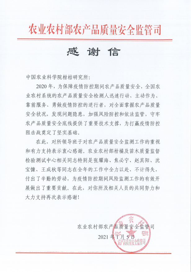 日前,柑桔所收到农业农村部农产品质量安全监管司的感谢信,对农业农村部柑桔及苗木质量监督检验测试中心(以下简称部柑桔质检中心)参与2020年国家农产品质量安全风险监测工作中作出的重要贡献表示感谢。