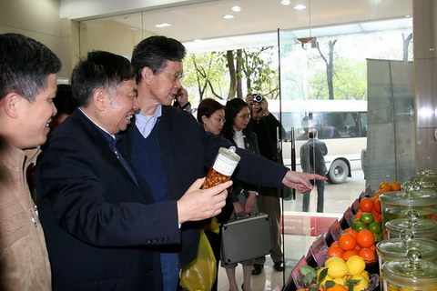 展示台上,摆满了刚从田间采摘的绿椪柑、明尼奥拉桔柚、佛手、金桔等柑桔品种,五彩缤纷、香气扑鼻、形状各异,引起了院士们和陪同的领导浓厚的兴趣。
