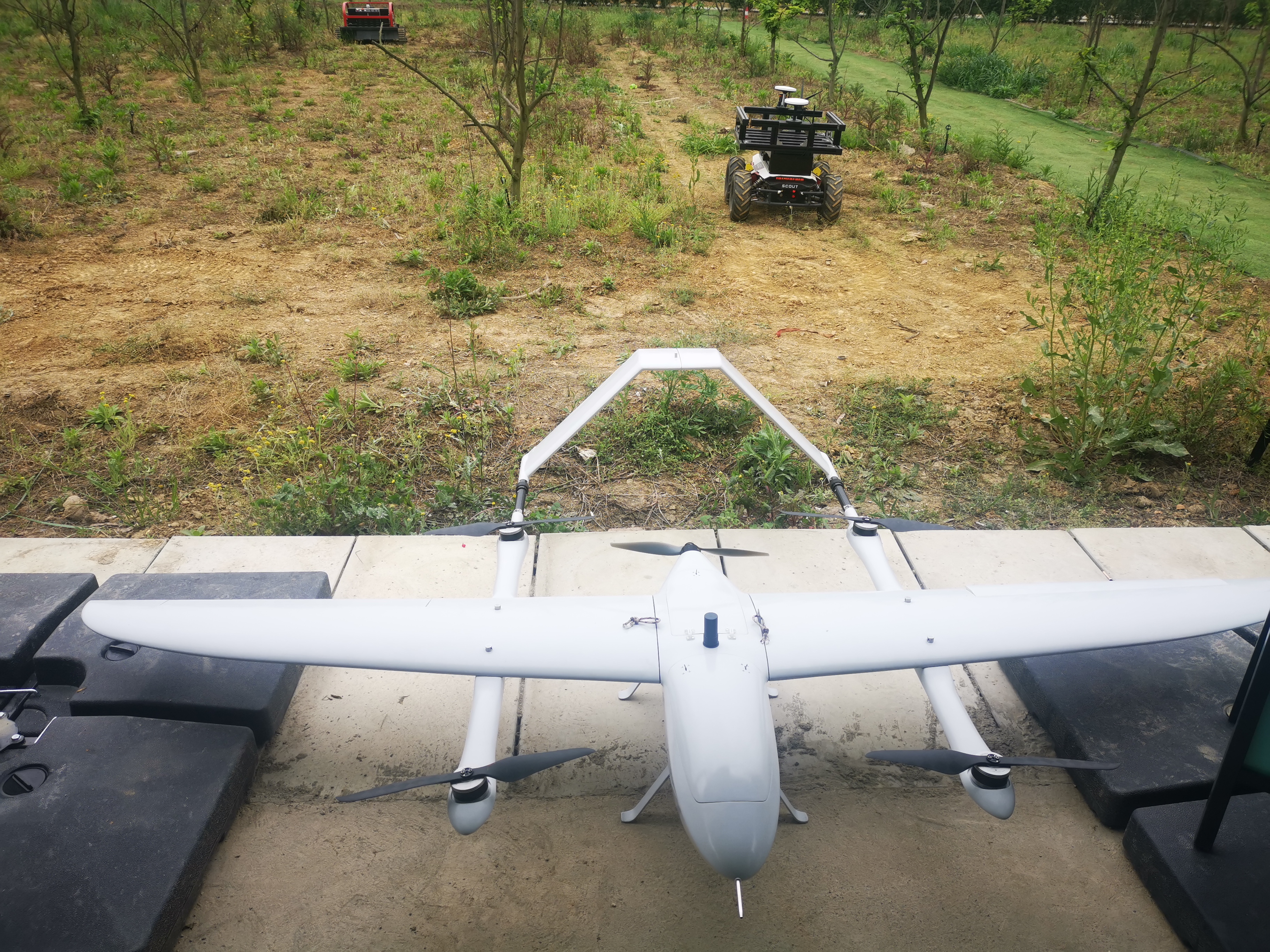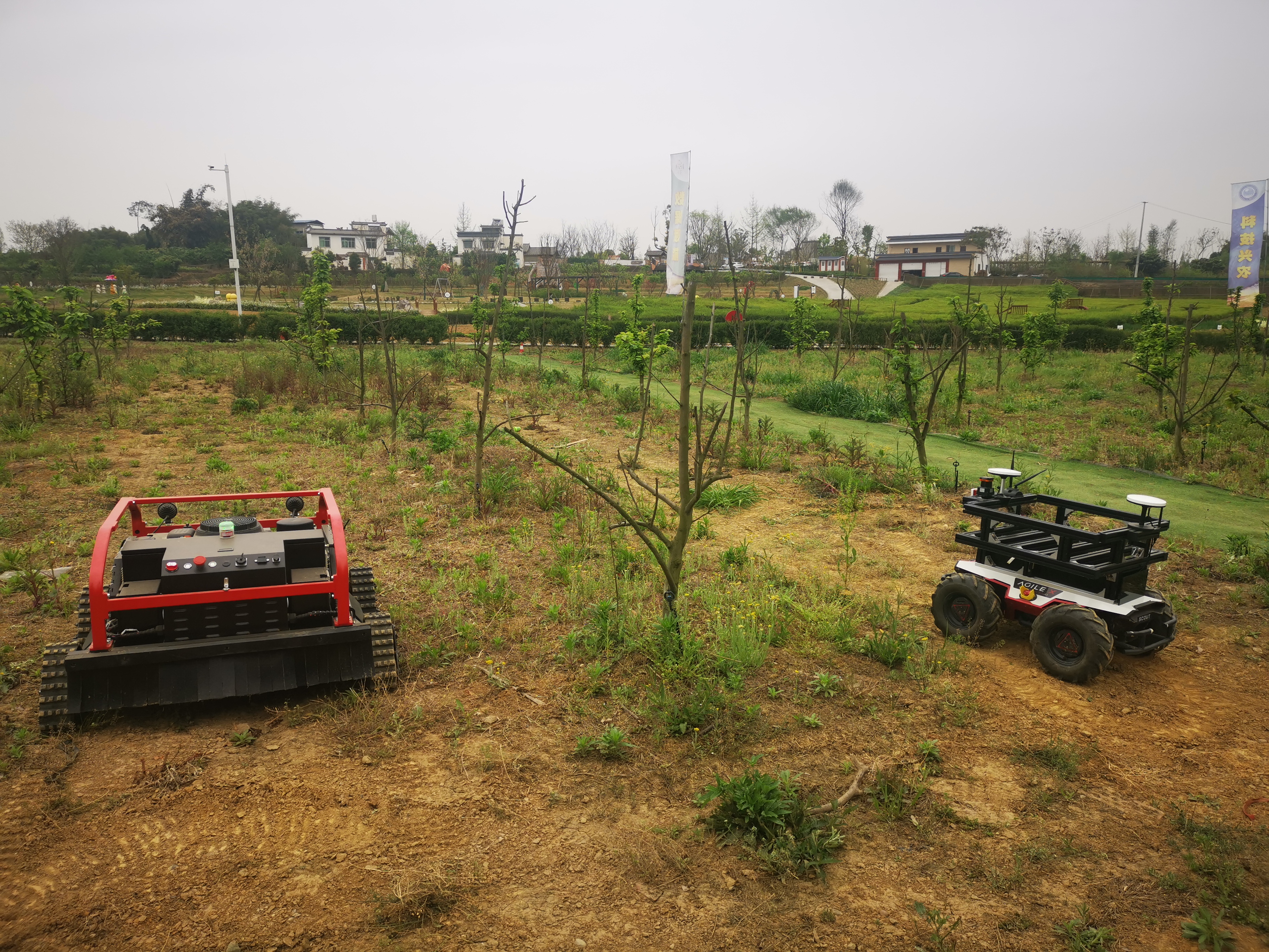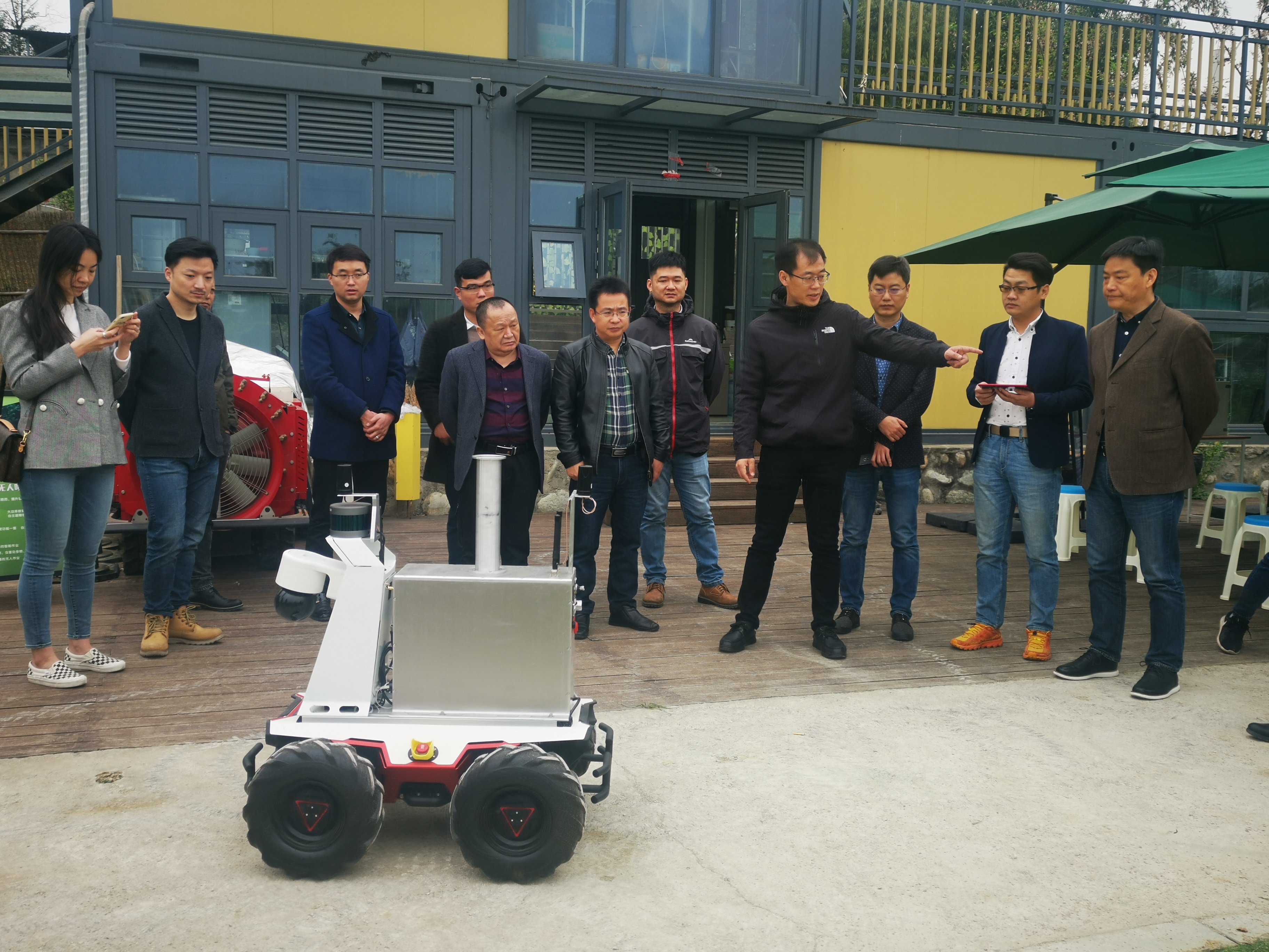 随后,考察组一行实地观看了无人机果园农情采集机、智能巡田机器人、无人喷药机器人、无人除草机器人、跟随搬运机器人、智慧农业田间服务一体机的操作示范。