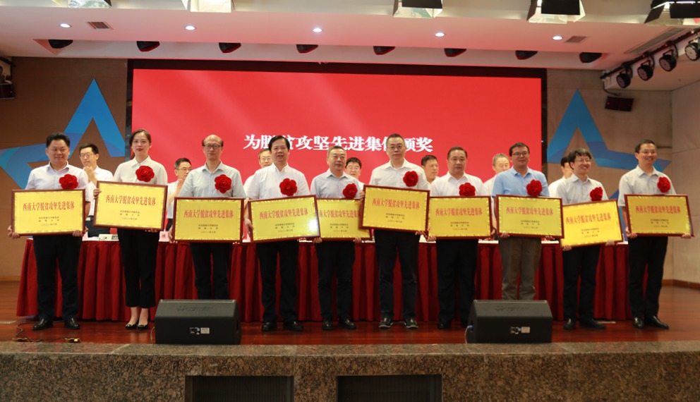 为表彰在脱贫攻坚历史进程中涌现出的先进集体和个人,在全校营造崇尚先进、学习先进、争当先进、赶超先进的浓厚氛围,6月23日,学校脱贫攻坚总结表彰暨服务乡村振兴战略工作推进会,并在会上表彰了10个先进集体和20个先进个人。