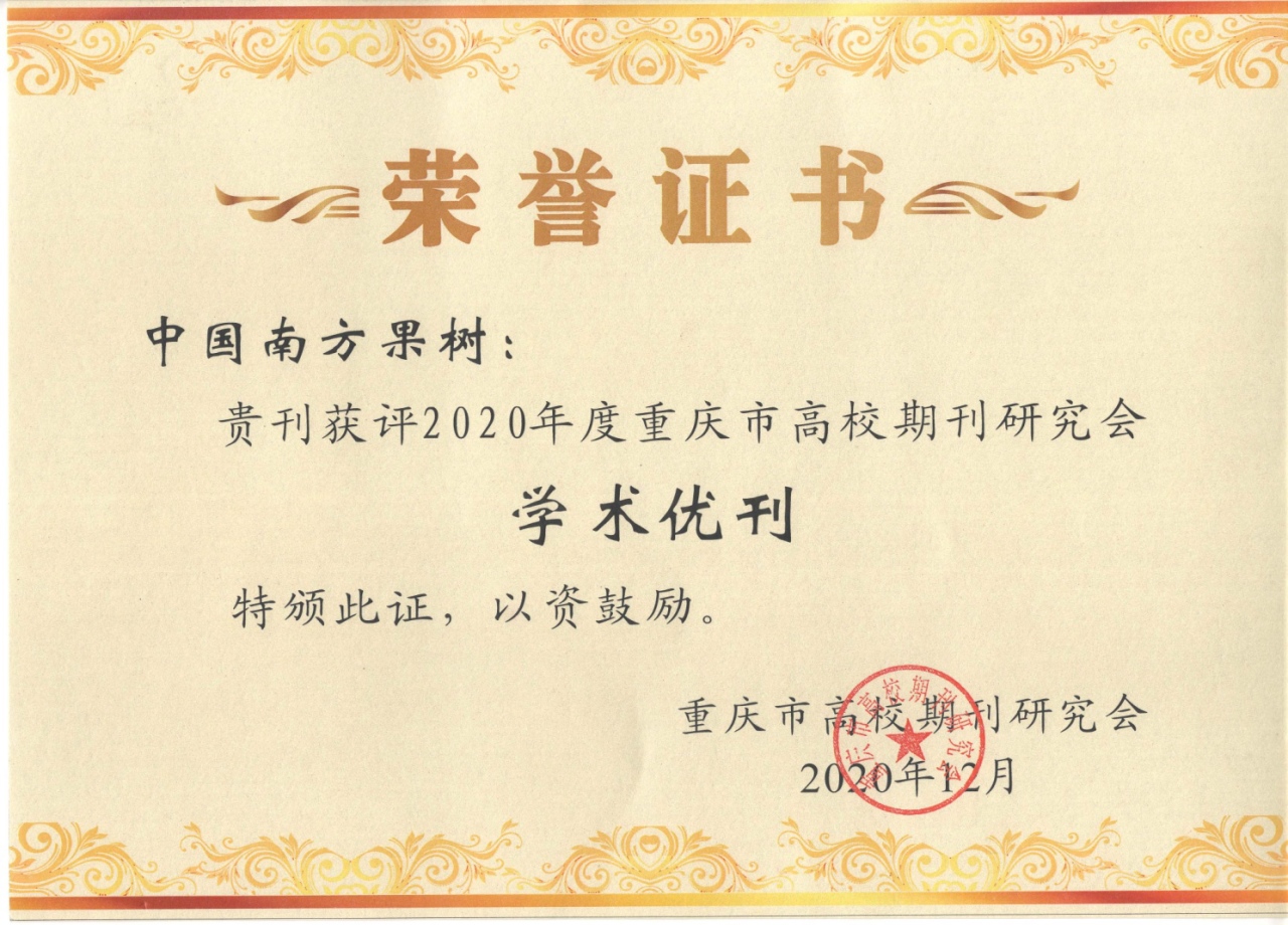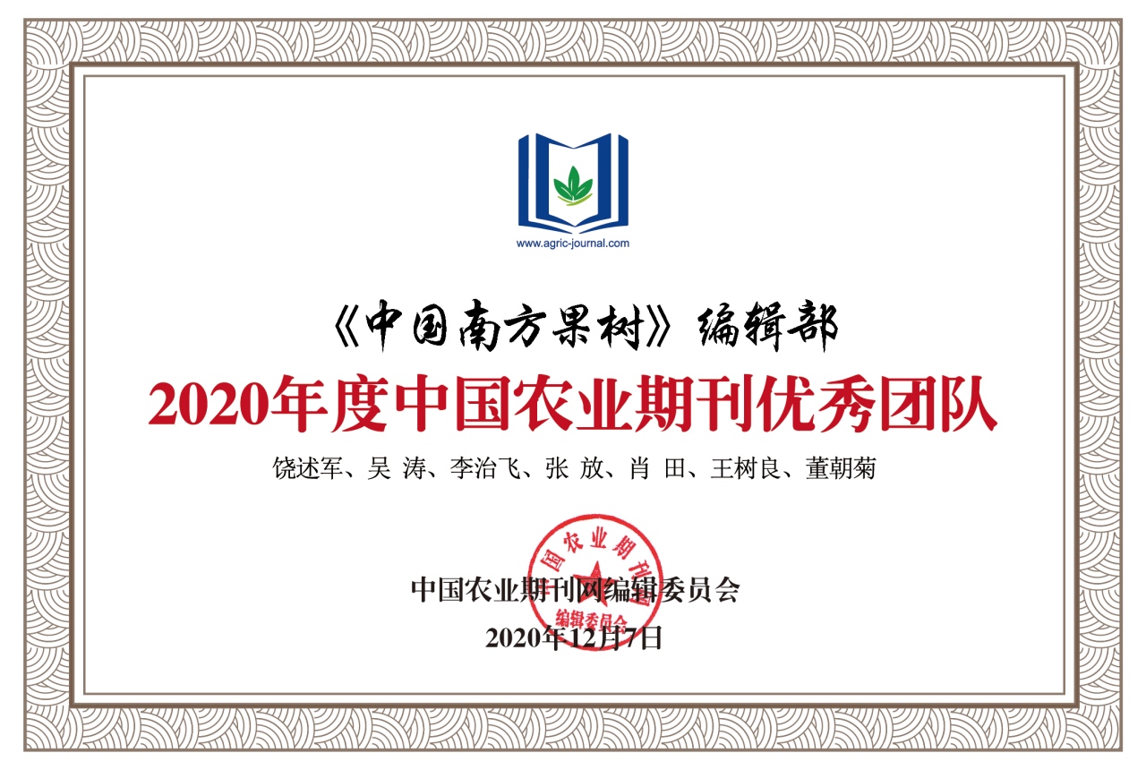 另外,《中国南方果树》还入选了《我国高质量科技期刊分级目录》农业领域T3类期刊,2020年度重庆市高校期刊研究会“学术优刊”。《中国南方果树》编辑部被中国农业期刊网编辑委员会评选为“2020年度中国农业期刊优秀团队” ,被重庆市高校期刊研究会评为 “2020年学会工作先进单位”称号。