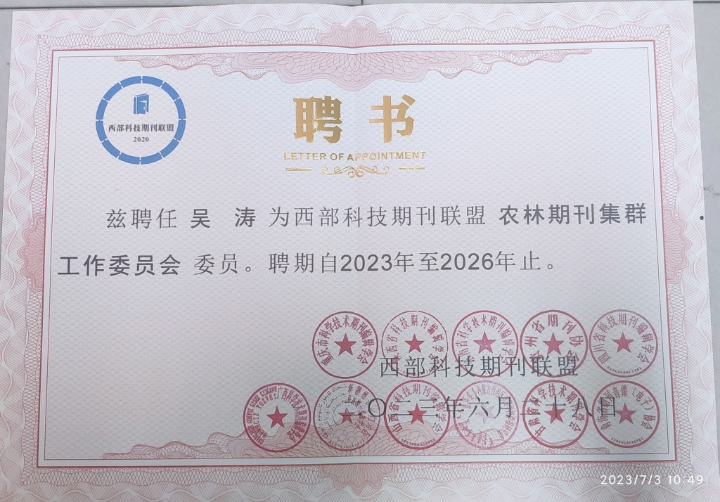 为充分发挥西部农林期刊的集群效应,推动西部农林期刊的学术质量和学术影响力提升,西部科技期刊联盟成立了首个工作委员会“农林期刊集群工作委员会”,委员会成员由西部各省科技期刊编辑学会各推荐1人组成。吴涛被重庆市科技期刊编辑学会推荐,被聘为委员。
