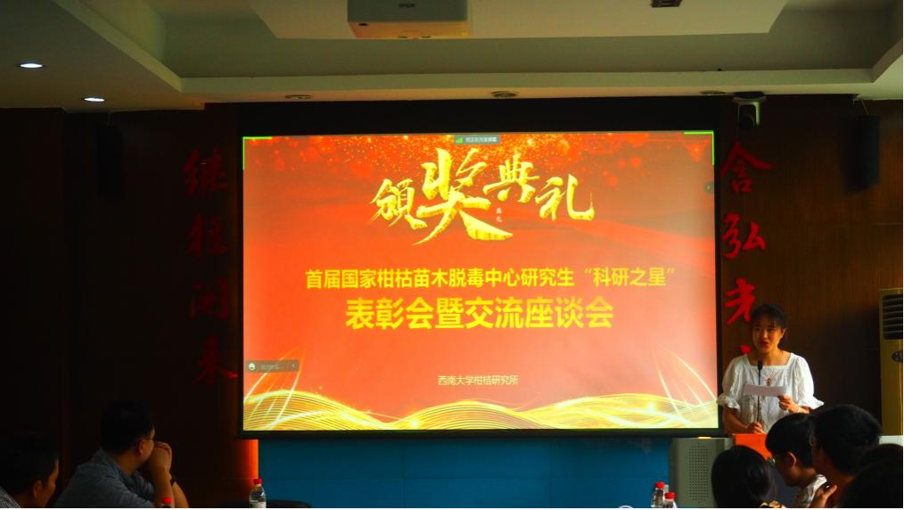 为激发同学们对科学研究的激情,培养出又红又专的科技人才,2023年7月28日,国家柑桔苗木脱毒中心在我所综合楼第二会议室举行了首届“科研之星”颁奖仪式暨交流座谈会(未能到场的师生线上参会),中心全体师生进行交流座谈,表彰在2021至2023学年度于科研方面作出较为突出贡献的同学,并进行经验分享交流。