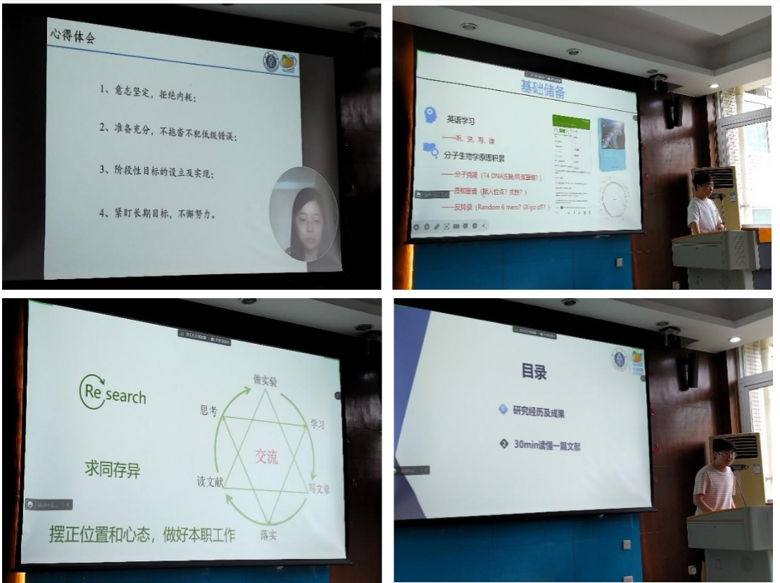 会议第三项,14位同学结合自身体验进行经验分享:张松从国家需求、产业问题出发阐述了做科研的意义;苏越谈到拟订计划对完成学术论文写作的重要性;刘齐燕提到了要从兴趣出发,去探索科学研究中未知领域;杜娇则从拒绝内耗、积极实现阶段性目标和长期目标以此获得成就感和大家分享心得;玄志友则从读文献、做实验、写文章这三个相互影响的点和大家分享自己的思考;梁晓飞建议大家长期保持英语学习能力,深入了解分子生物学相关原理;崔学进分享了快速读懂一篇文献的好方法。其余同学也从不同角度阐述了如何做好科学研究,如何协调工作与生活,以更好地完成学业。