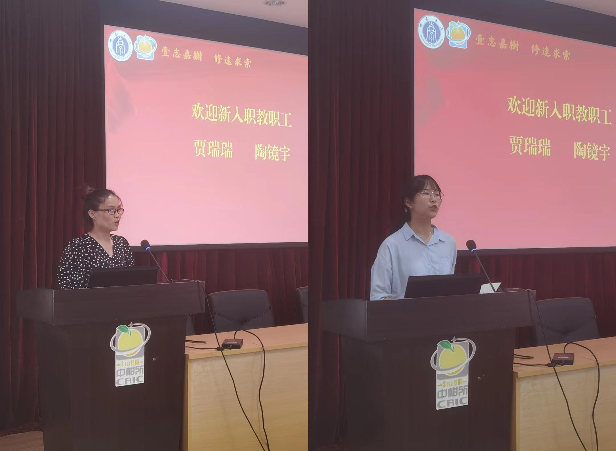 随后,2023年上半年两位新进教职工上台作自我介绍,贾瑞瑞、陶镜宇两位同志在自我介绍的同时,对未来的职业生涯规划作了简单的说明。