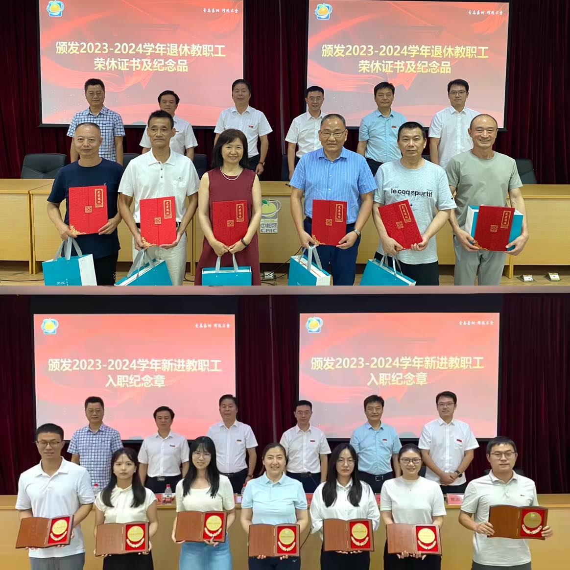 全体所领导为2023-2024学年退休教职工代表颁发了荣休证书和纪念品,为2023-2024学年新进教职工颁发了入职纪念章,并合影留念。
