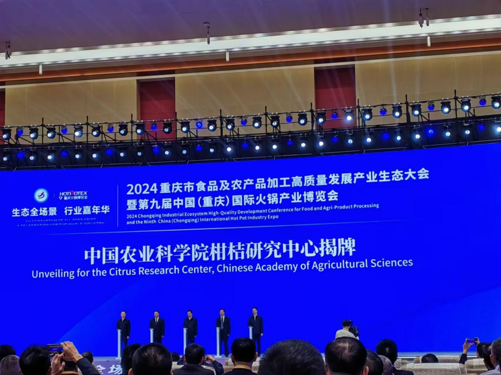 10月25日,中国农业科学院柑桔研究中心在2024重庆市食品及农产品加工高质量发展产业生态大会开幕式上揭牌成立。重庆市委副书记、市长胡衡华,重庆市副市长郑向东等市领导,中国农业科学院副院长叶玉江,学校党委书记张卫国同时按下启动按扭,成功为“中国农业科学院柑桔研究中心”揭牌。中国农业科学院科技局局长李新海、学校党政办公室主任靳拥军、科技处副处长段有德、我所所长王雪峰,以及出席开幕式的嘉宾共同见证了这一重要时刻。
