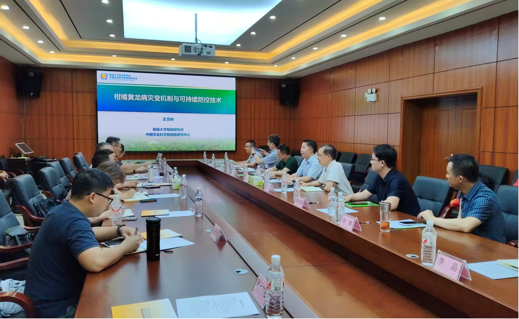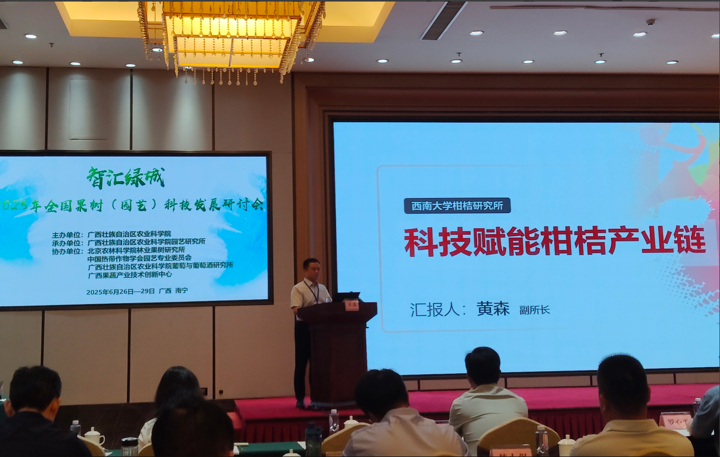 调研考察期间,所长王雪峰应邀在广西水果技术指导站作柑桔黄龙病机制研发最新科研进展专题报告。黄森副所长代表柑桔研究所参加了“智汇绿城·2025年全国果树(园艺)科技发展研讨会,会上,黄森以《科技赋能柑桔产业链》为题交流了我所“十四五”所地合作和成果转化实践经验。