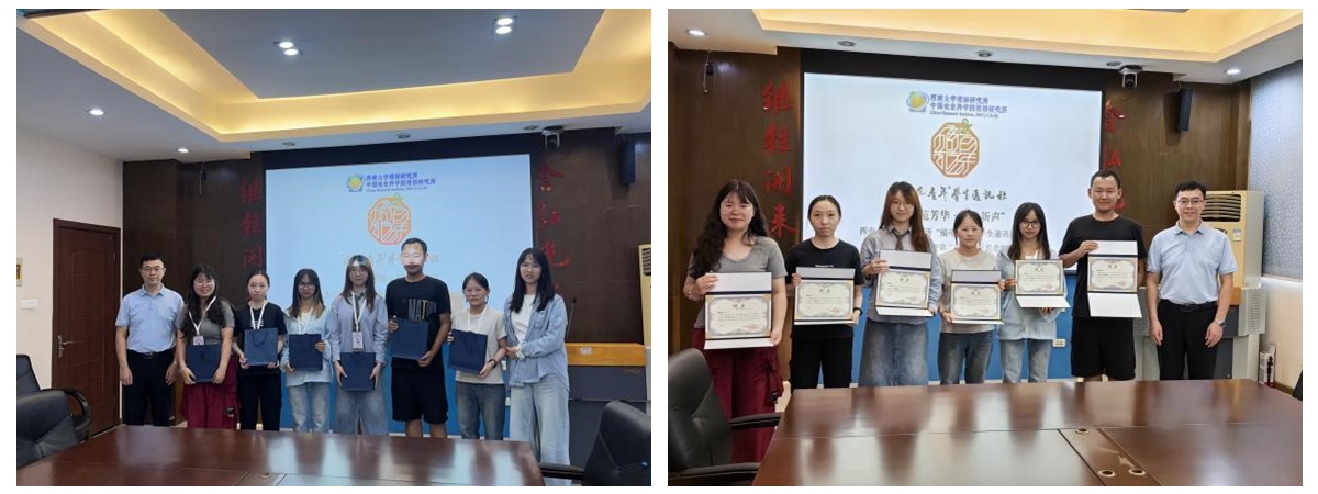 (左)教师指导社长陶镜宇为通讯员颁发纪念品 (右)刘昭暾为通讯员们颁发聘书