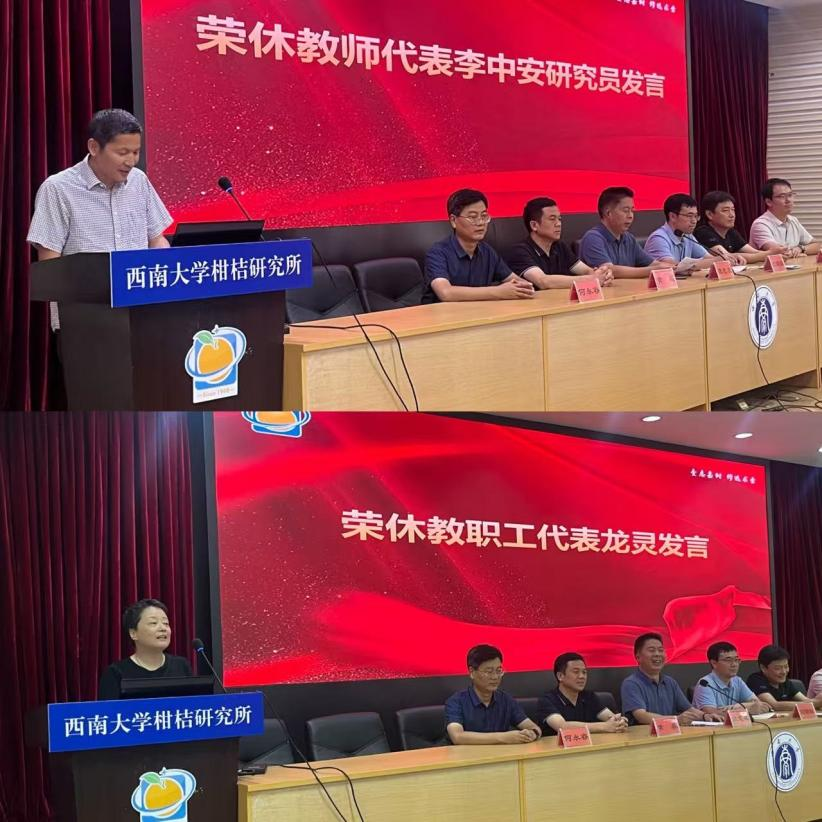 李中安研究员、龙灵同志作为2024-2025学年退休教职工代表分别发表了离别感言。他们深情回顾了自己在柑桔研究所数十年的工作历程,分享了自己在科研攻关、人才培养、管理服务过程中的难忘经历,这些点点滴滴的付出,最终都转化为一个个科研成果的突破与我所事业发展蒸蒸日上的喜悦。两位退休教职工代表的发言真挚动人,饱含着他们对教育、科研事业的热爱与爱所荣所的高尚品德,让在场教职工深受触动。