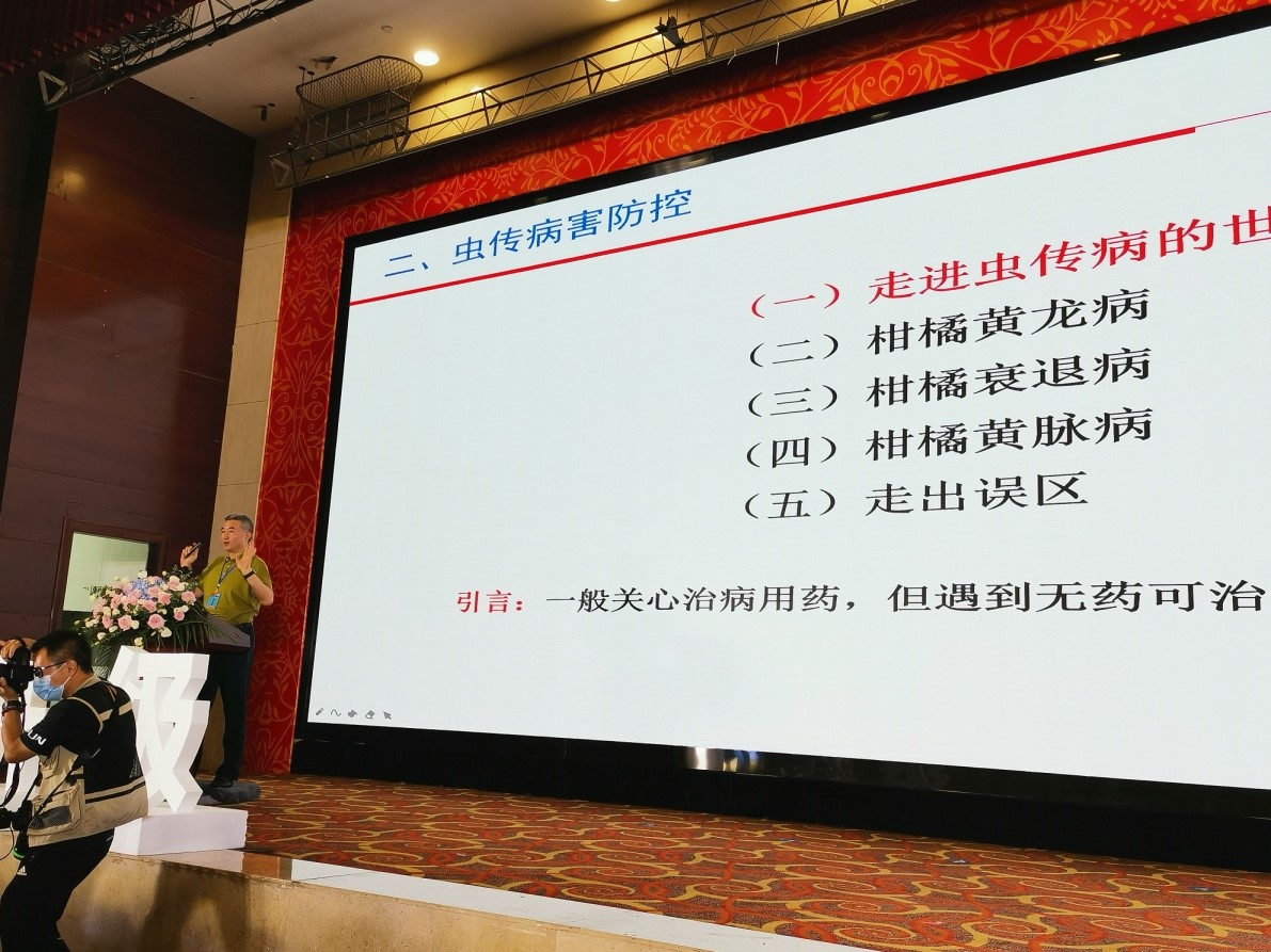 周常勇研究员从柑桔产业转型和虫传病害防控两个方面,重点论述了产业转型需要从资源、技术、资本、文化四个方面努力,虫传病害防控方面重点介绍了黄龙病、衰退病、黄脉病的发生规律和防控要点。