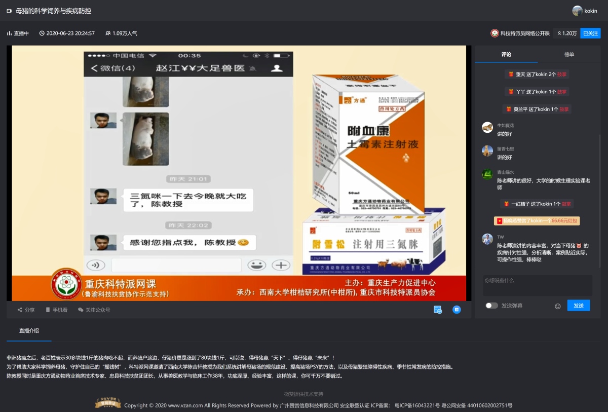 “如果母猪发病,死后嘴里流红色泡沫,主要考虑猪肺疫。”“猪在不同季节感染致病菌概率不一样。”……如何做好预防非洲猪瘟的生物安全防控措施、饲料禁止用抗生素后该如何饲养都是农户关心的问题,在直播互动时间里,不少农户抓住机会抢着提问,陈吉轩一一作答。作为重庆市猪病临床防控首席专家,陈吉轩常年奔波在农村一线,被农户们亲切地称为“泥腿子”教授,这次带来了满满地“干货”,直播观看数也达到了2.21万人次,成了直播课观看量最多的一场。
