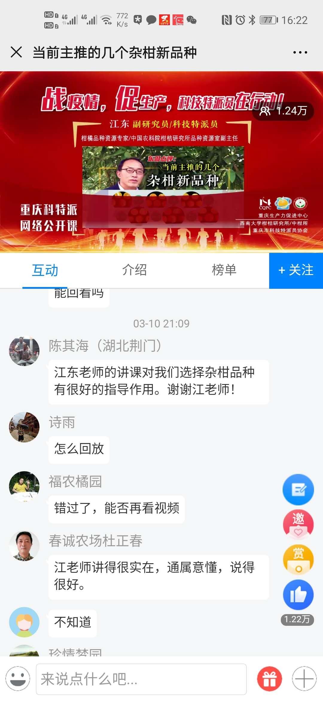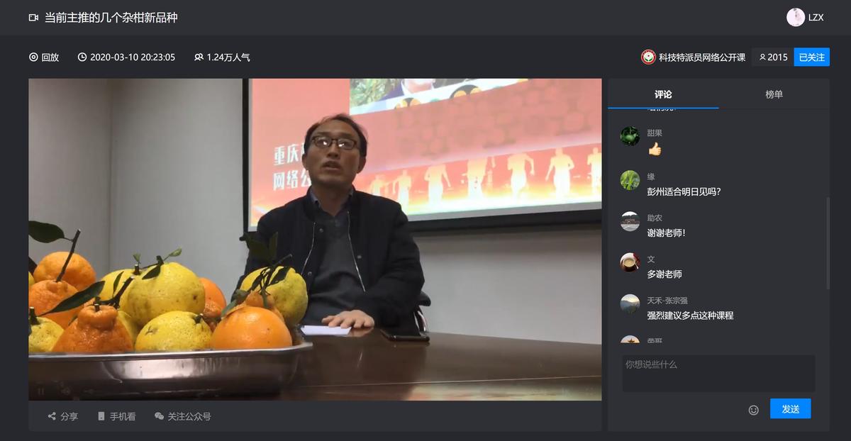 首场直播持续了40多分钟,主讲人讲得精彩、观众们听得耐心。不少观众参与了互动,大呼过瘾:品种在当地的适应性、直播后能否回放、网络直播形式能否常态化开展,都是大家热议的话题。直播中,除科特派网课平台有1.1万受众外,华中农大主办的“大咖说橘”等平台也同步转播了本期话期,5000多受众倾听,成效远远好于预期。由于筹备时间短,新冠肺炎疫情也给视频录制、工作交流等带来了诸多不便,重庆市科技特派员协会理事长、节目的策划人邓烈研究员“连续几天睡不着觉”,协会秘书长范守城研究员“直播预告后每天醒来的第一件事就是看下平台增粉了没有”,柑桔研究所网络信息中心姜国金主任零起点学直播、导播,做视频剪辑和宣传设计。倾尽心血,目不窥园,直播顺利结束后,满分的直播成绩单,让大家舒心地笑了。