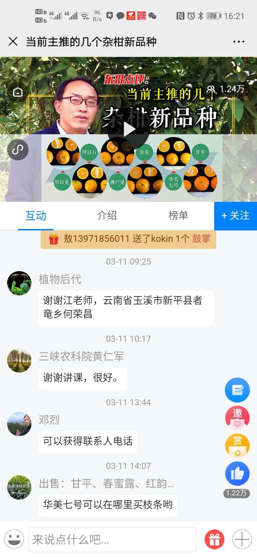 3月10日晚上20:30,科特派网课如约而至,柑桔品种资源专家、柑桔研究所品种资源室副主任江东副研究员为全国观众开启了科特派首场、题为“当前主推的杂柑新品种”的直播话题,江老师在课程中娓娓讲解了我国当前和未来一段时期柑橘产业主推的明日见、明日行、濑户见、清美、华美7号、甘平等杂柑新品种,介绍了这些新品种的选育引种过程、果实品质表现、树体生长结果特征、栽培技术要点等,并耐心细致地回答了直播过程中观众提出的一些典型问题。