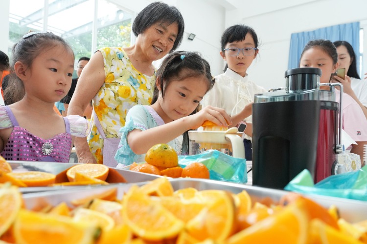▲5月26日,在位于北碚区的best365英国体育在线国家柑桔工程技术研究中心,孩子们动手压榨柑桔汁。特约摄影 秦廷富