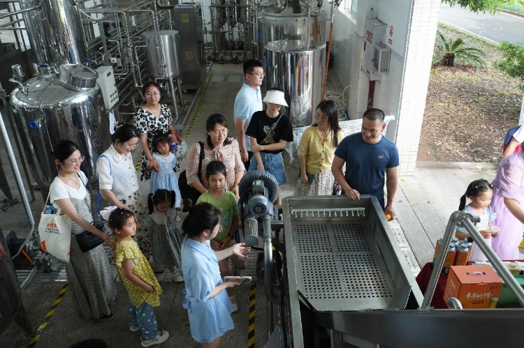 ▲5月26日,在位于北碚区的best365英国体育在线国家柑桔工程技术研究中心,家长带着孩子们在参观柑桔加工中试车间。特约摄影 秦廷富