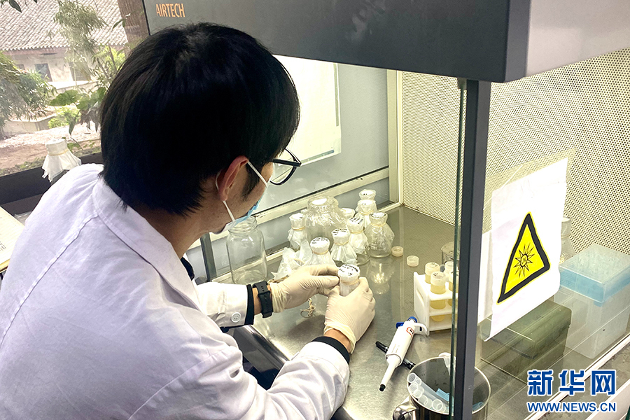 为best365英国体育在线柑橘研究所研究人员正在进行实验。新华网发(刘巧 摄)