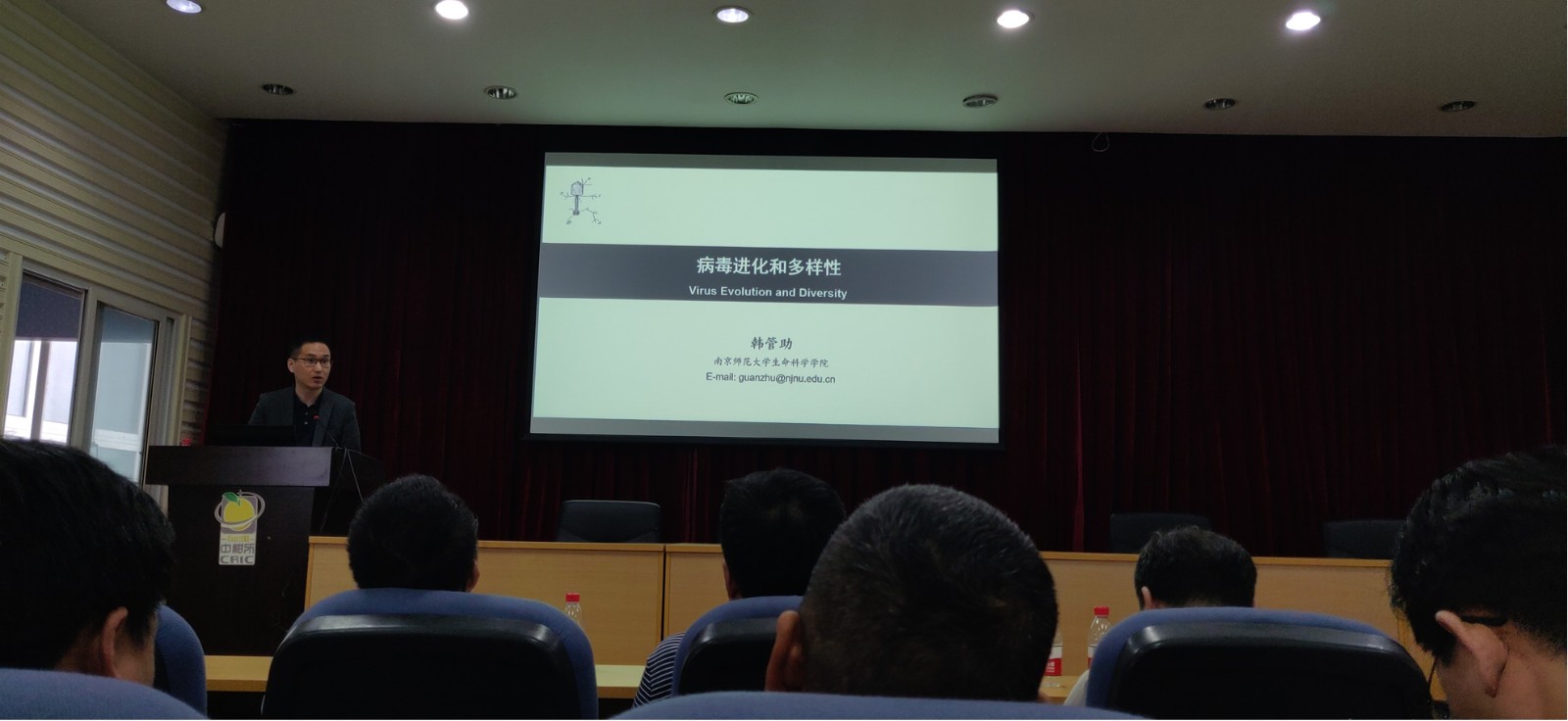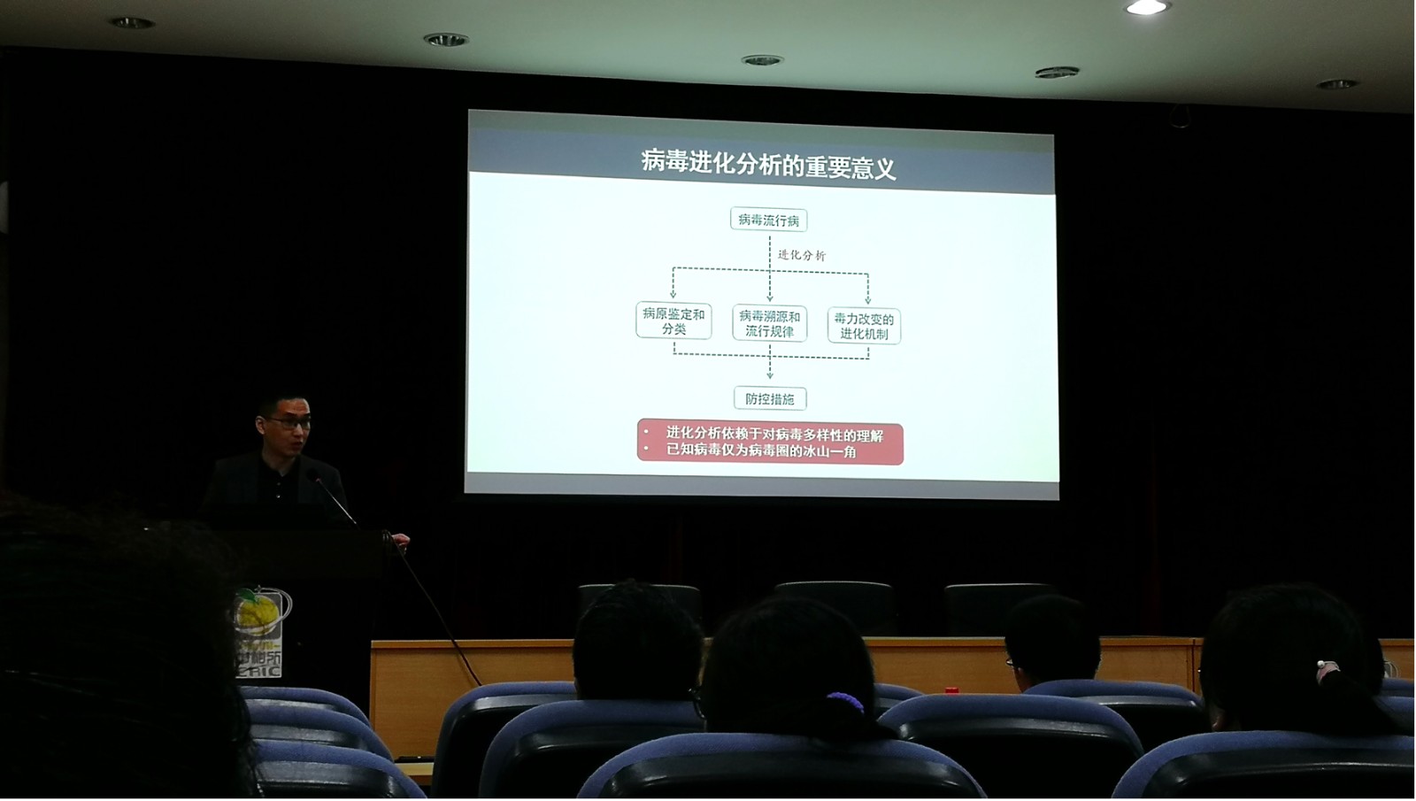 紧接着,韩管助教授作了题为“病毒进化和多样性”的报告,首先介绍了病毒进化研究对于病毒流行以及病毒多样性的意义,随后以逆转录病毒为例,介绍了在病毒如何起源与进化、内源性逆转录类病毒对宿主进化的影响等方面做的一些研究与探索。报告中,韩老师耐心详细地解答了老师和同学提出的问题,并与师生就相关问题进行了热烈讨论。