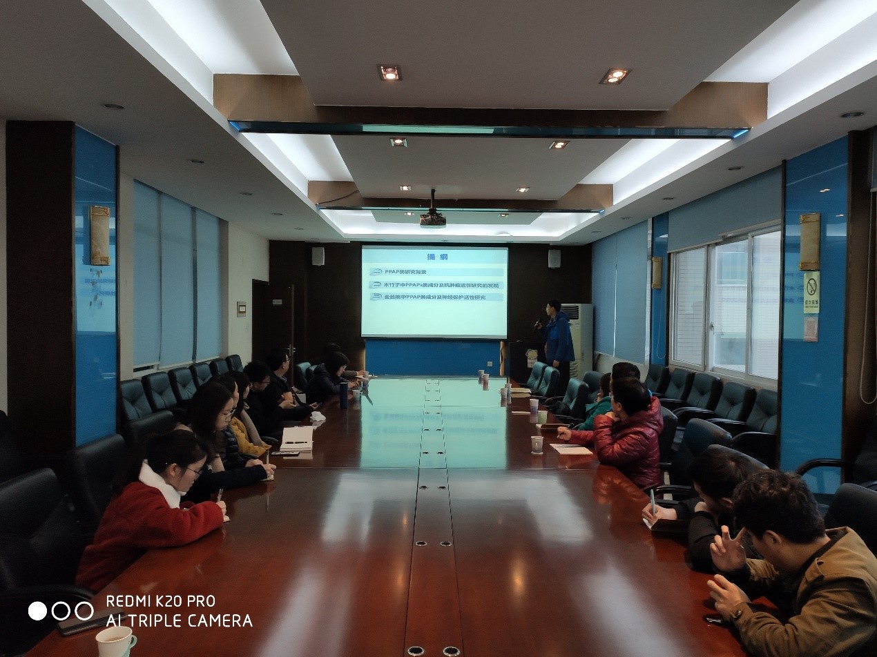 此次报告会由黄林华博士主持,他首先介绍了此次学术交流活动的背景。据悉,苑春茂博士和黄林华博士同在Wang Yu博士实验室进行了近两年的密切合作研究,彼此留下了深刻印象,约定回国后在保持现有合作的基础上,继续探索三方研究机构的合作新领域和新模式,于是有了此次北碚之约。苑春茂博士做了题为《黔产藤黄科药用植物中PPAP类化学成分及其生物活性研究》,系统地对黔产藤黄科药用植物中PPAP类(多环多异戊烯基间苯三酚类)开展深入研究,得到系列抗肿瘤活性较好的新骨架类PPAP化合物,并用化学转化方法实现骨架转化、结构修饰、活性评价及作用机制研究。苑博士的报告深入浅出、思路清晰,研究逐层深入,在药用植物天然产物活性成分研究方面发表了大量高水平论文,为我所师生带来了新的研究思路和方法。报告结束后,与会师生就报告内容以及柑橘研究过程中相关的问题进行了讨论。