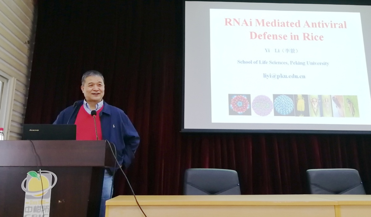 李毅教授以水稻病毒为切入点,重点介绍了水稻矮缩病毒(RDV)和水稻条纹叶枯病毒(RSV)与寄主的互作机制,从RDV和RSV的起源、传播方式、生物学特征、分子特点及RNAi等方面作出解析,明确了在RNAi途径中, 水稻AGO1和AGO18通过竞争性结合内源miR168,促使AGO1结合RSV来源的siRNA,从而共同诱导基因沉默,实现水稻抗RSV;此外miR528通过负调控AO基因、RSV CP基因过表达使水稻AGO18蛋白和JA积累,亦能达到水稻抗RSV的目的。