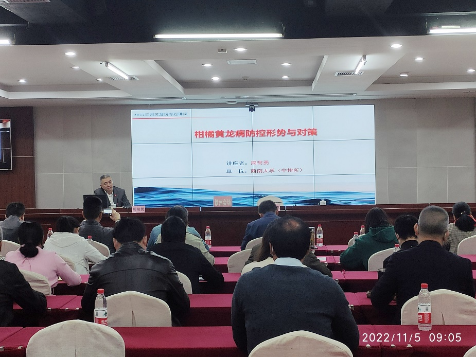 5日上午,周常勇理事长作了“柑橘黄龙病防控形势与对策”专题讲座,围绕“产业概况、防控形势、防控对策”,全面讲解了柑橘产业发展现状与挑战、深刻分析了国内外柑橘黄龙病发生形势,提出了有效的防控对策。赣州市18个县(市、区)政府分管领导、全市果业部门领导干部、乡镇分管领导、果技人员及果农代表等千余人在线上或线下同步参会。通过此次培训进一步引起了地方政府对黄龙病防控工作的高度重视;坚定了果农的防控信心;提升了绿色、可持续的黄龙病治理理念,将有力促进赣州乃至全国的柑橘产业安全。