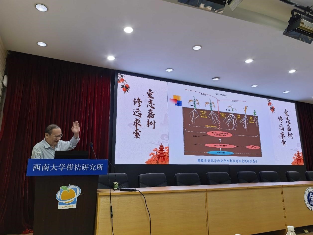 2025年9月19日,我所柑桔栽培与生理中心特邀中国农业大学领军教授、著名化学生态学专家孔垂华教授来所进行学术交流并作专题报告。孔教授长期从事植物化学生态学研究,尤其在植物化感作用和植物化学识别通讯研究方面一直处于国内外前沿。现任中国生态学会化学生态学专业委员会副主任委员、中国植物保护学会植物化感作用专业委员会名誉主任委员。