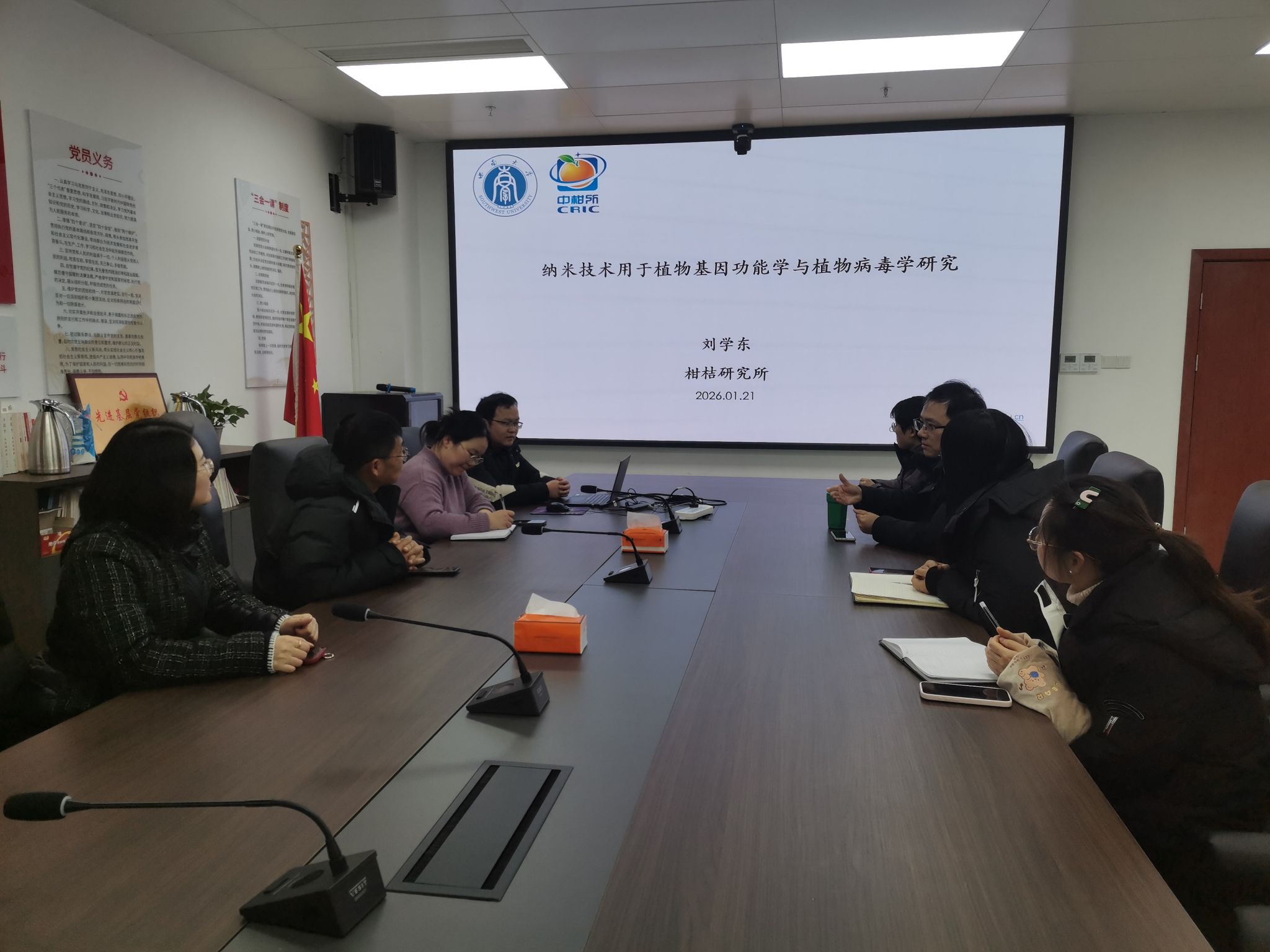 学术交流会上,胡新龙所长首先代表江西农科院园艺所对我所考察组的到来表示热烈欢迎,并全面介绍了该所在园艺领域科技创新突破、人才梯队建设与团队培育、科研成果转化应用等方面的丰硕成果,重点阐述了江西省柑桔产业的发展现状、核心优势及未来布局,为双方精准对接合作找准了切入点。曹孟籍副所长结合我所发展实际,详细介绍了best365英国体育在线柑桔研究所的发展历程、核心科研平台优势及近年来在柑桔育种、栽培、病虫害防控等领域的标志性成果,并围绕国家自然科学基金项目申报的流程要点、选题技巧、团队协作等关键环节,分享了宝贵经验,为双方科研人员申报高水平项目提供了重要指引。刘学东副研究员作了题为“纳米技术用于植物基因功能学与植物病毒学研究”的专题报告,该研究为植物基因功能研究和病毒防控提供了全新思路,对解决柑桔产业生产中的实际问题具有重要启发意义。