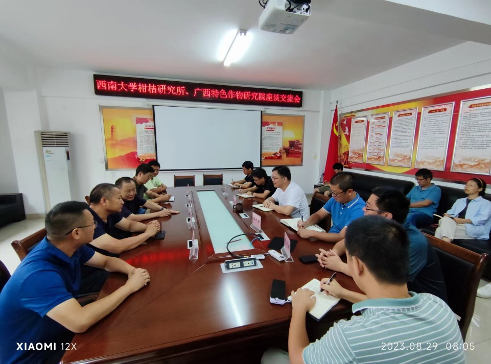 8月29日,陈善春带领大家与广西特色作物研究院领导专家进行座谈,双方就柑桔新品种选育、种苗繁育技术和柑桔黄龙病防控等相关问题进行了交流。针对广西近年来柑桔生产上出现一定比例僵果的问题,广西特色作物研究院郭小强院长特别提出与我所合作开展柑桔僵果防治研究的建议。座谈会后,在柑桔产业技术体系试验站站长陈传武等人的陪同下,陈善春到灵川广西特色作物研究院的柑桔栽培技术示范基地调研,了解脆蜜金柑保花保果、防日灼等栽培管理技术,并就生产过程中出现的问题进行交流。
