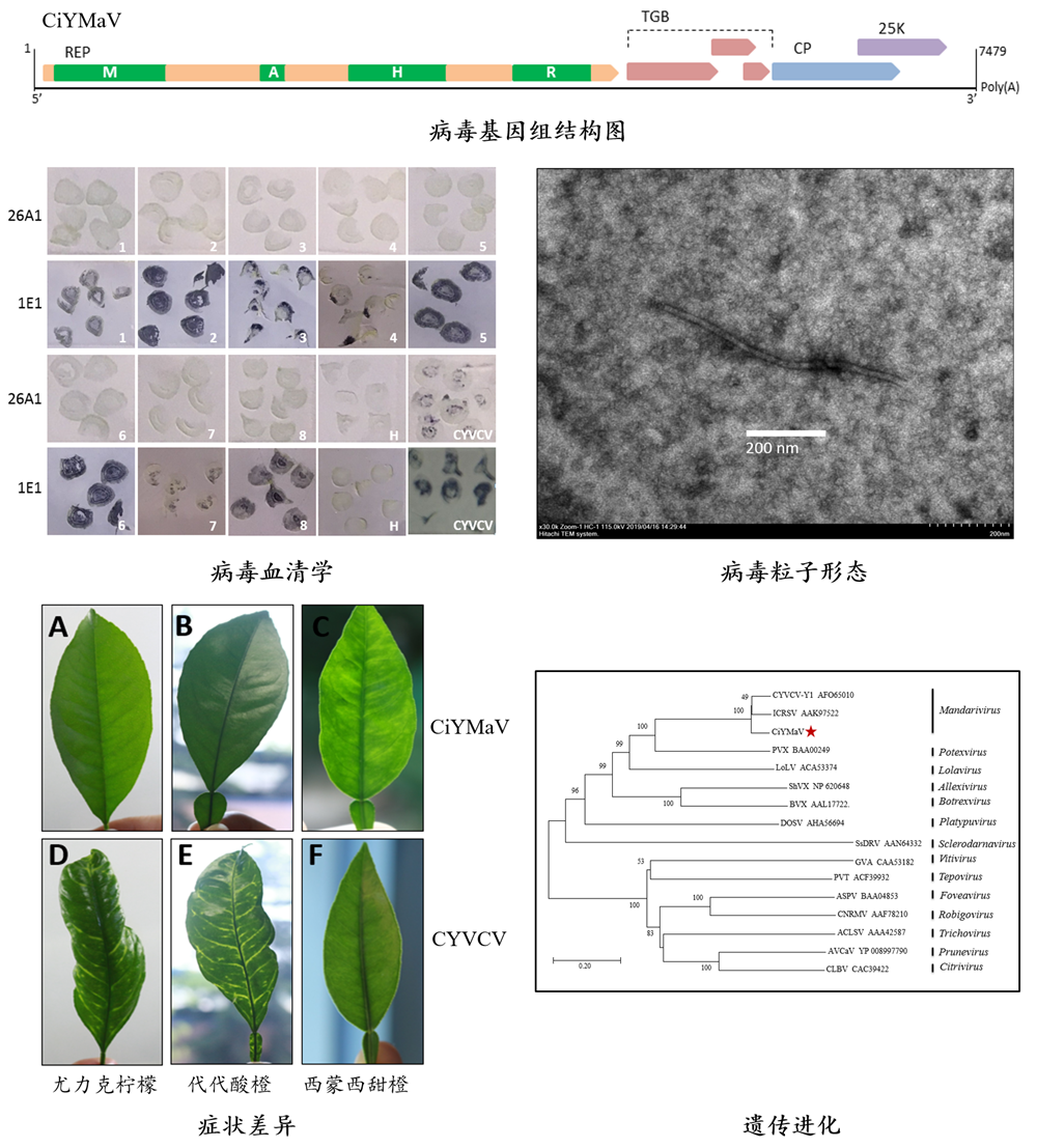 图1 柑橘黄化斑驳相关病毒(CiYMaV)基因组结构、遗传进化、血清学、病毒粒子及生物学特性
