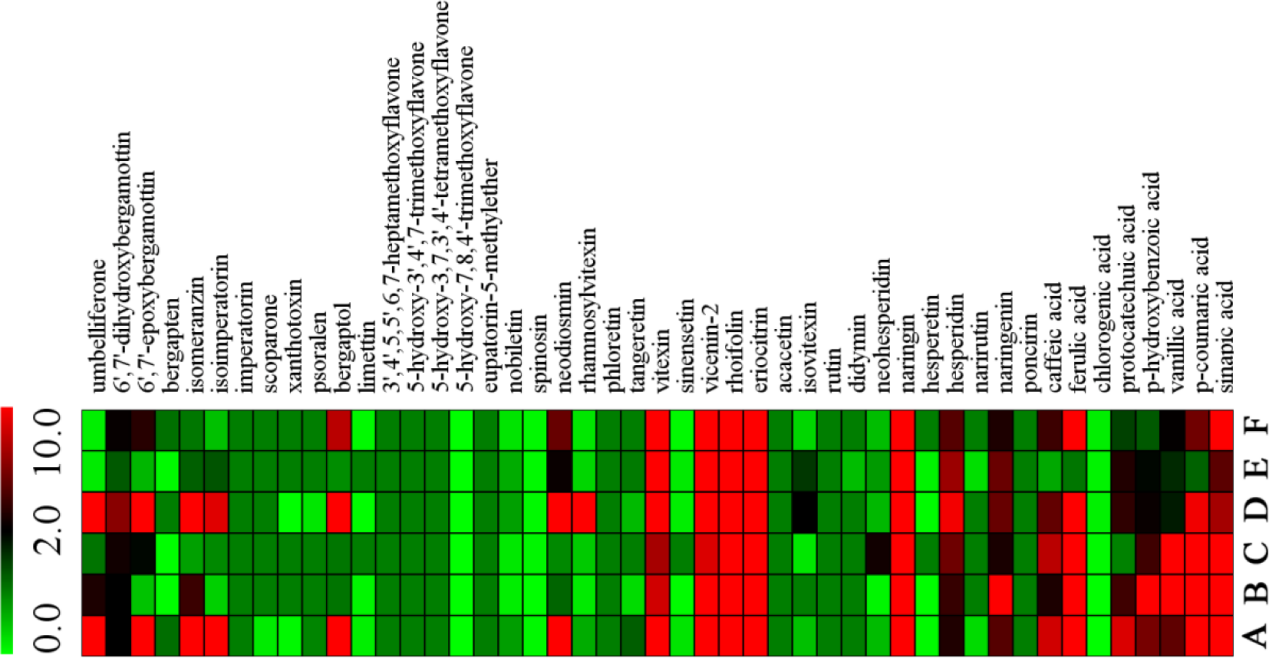 近年来,由于次生代谢物对水果品质、植物生长和人类健康的影响,人们越来越需要快速准确的分析方法来定性和定量这些代谢物。焦必宁课题组建立了一种同时分析香豆素类、呋喃香豆素类、类黄酮和酚酸等柑橘次生代谢产物的新方法。该方法通用性强,可在13分钟的色谱分析时间内对47种物质进行分析,结果表明该方法具有较高的灵敏度和良好的选择性。优化了色谱梯度程序,使13组异构体在短时间内完全分离。该方法灵敏度高,可检出柑橘果实之前并未报道的成分。已成功应用于柚果实种47种次生代谢产物的靶向筛查和定量分析。此外,该方法具有良好的选择性,可以准确地鉴别存在的同分异构体。该方法是一种新的、先进、通用的UHPLC-QqQ-MS/MS方法,可用于多种水果和植物中次生代谢产物的快速分析,从而有助于进行质量评价和相应功能产品的开发。