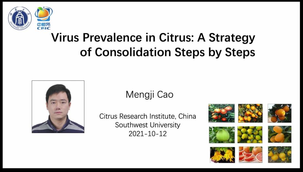 本次研讨会的主题是不同作物病毒流行的影响因素,包括柑橘、葡萄、番茄、小麦、棉花等13种作物,旨在交流影响不同作物病毒流行的因素,及病毒流行情况,以便进行更好地防控。脱毒中心曹孟籍研究员受邀参加网络研讨会,并以“Virus prevalence in citrus: a strategy of consolidation steps by steps”为题,做柑橘病毒病流行的相关报告。