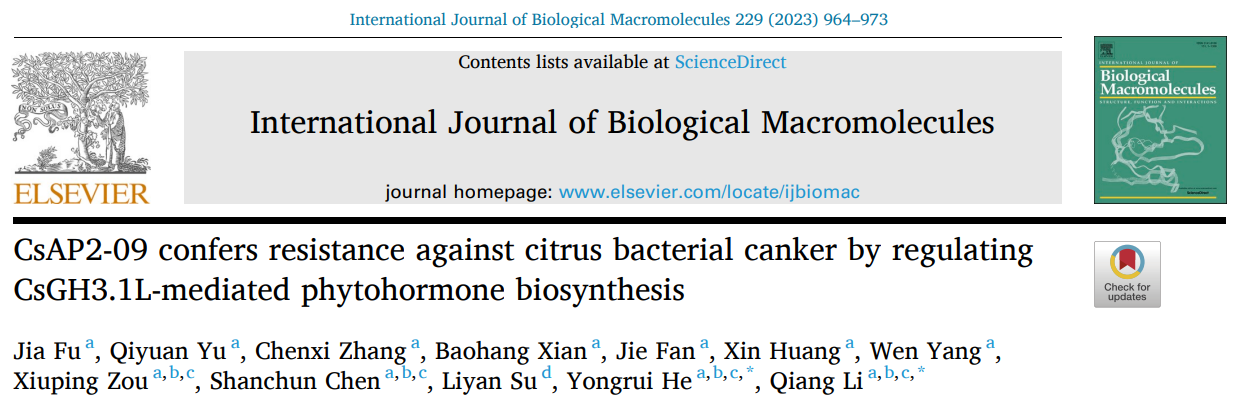 2023年1月10日,国家柑桔品种改良中心在国际期刊《International Journal of Biological Macromolecules》(中科院1区Top期刊,IF2021=8.025)发表题为“CsAP2-09 confers resistance against citrus bacterial canker by regulating CsGH3.1L-mediated phytohormone biosynthesis”的研究论文,报道了CsAP2-09通过CsGH3.1L正调控柑橘溃疡病抗性的机制。