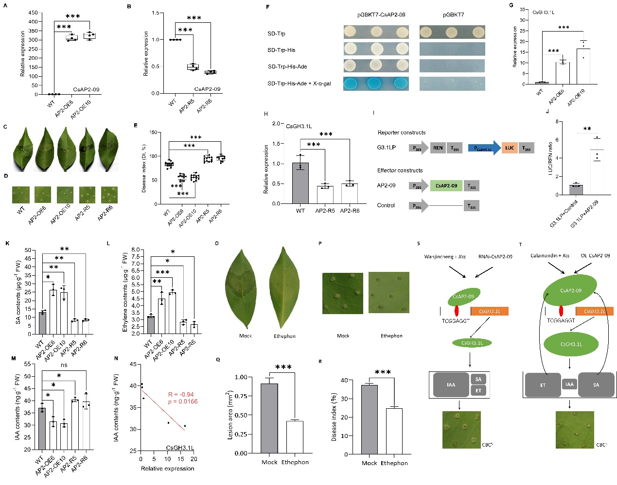 柑橘溃疡病是由柑橘黄单胞杆菌柑橘亚种(Xanthomonas citri subsp. citri,Xcc)引起的细菌性病害,严重危害柑橘产业的发展。CsAP2-09系该团队前期鉴定的柑橘溃疡病抗性基因,在Xcc诱导下CsAP2-09在抗病种质四季橘中的表达上调,而在感病品种晚锦橙中表达变化不明显,CsAP2-09过表达可明显增强转基因柑橘对溃疡病的抗性(He et al., 2019)。GH3在植物生长素信号途径及防卫反应中有重要作用,CsGH3.1L过表达可增强溃疡病抗性(Zou et al., 2019)。但CsAP2-09和CsGH3.1L对柑橘溃疡病抗性的调控机制尚不清楚。