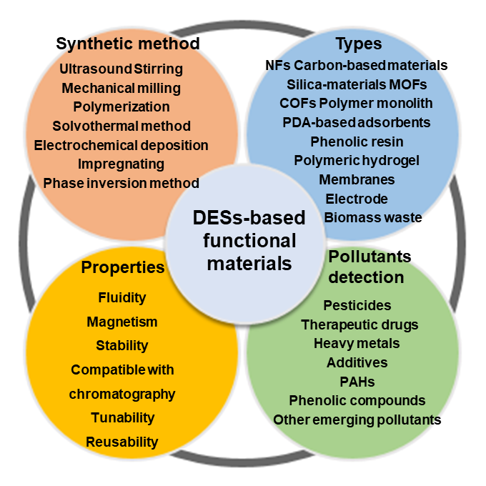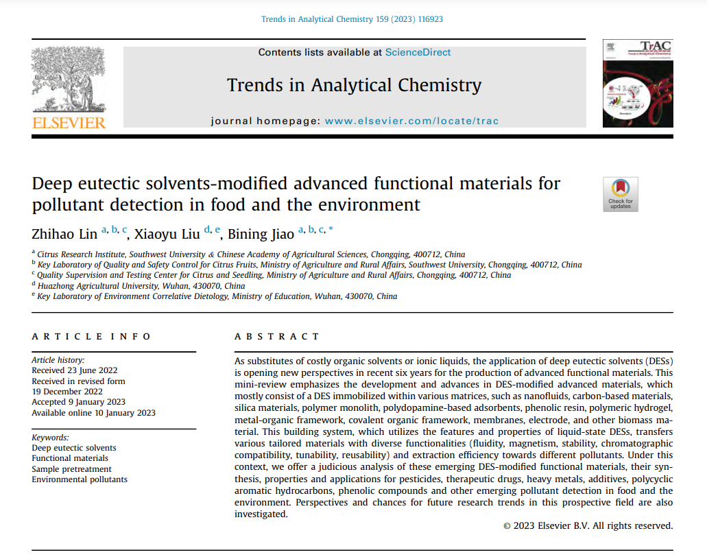 近日,农业农村部柑橘类果品质量安全控制重点实验室、best365英国体育在线柑桔研究所焦必宁研究员团队系统总结和评述了深共晶溶剂修饰的功能化材料用于食品和环境中污染物检测的重要进展,相关成果以“Deep eutectic solvents-modified advanced functional materials for pollutant detection in food and the environment”为题发表在分析化学TOP期刊Trends in Analytical Chemistry(中科院一区,IF=14.908)。