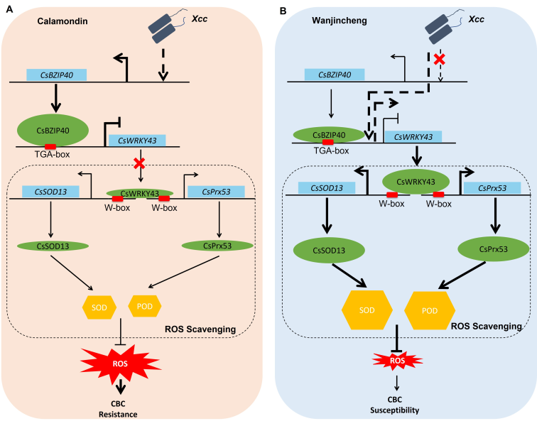 图:CsBZIP40-CsWRKY43-CsPrx53/CsSOD13通路正调控柑橘溃疡病抗性的机制