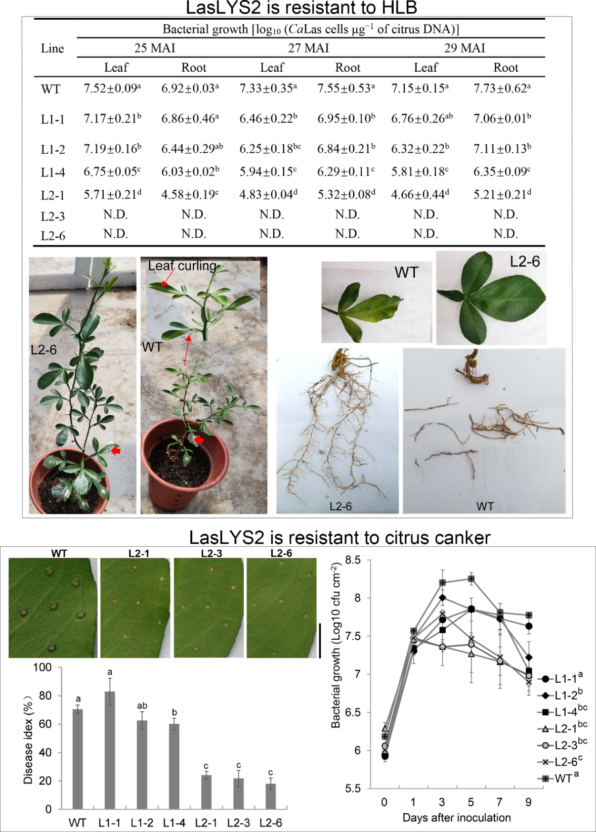 研究团队从柑橘黄龙病菌基因组中获得了2个原噬菌体的endolysin基因LasLYS1、LasLYS2,离体和活体抑菌实验表明LasLYS2蛋白对几种根瘤菌细菌和柑橘溃疡病菌Xcc均有杀菌活性。通过转基因将LasLYS1、LasLYS2导入柑橘枳橙砧木中,经过29个月的黄龙病菌持续攻毒实验,转基因植株表现出了显著的黄龙病抗性,说明LasLYS1、LasLYS2具有持久抗病性,特别是LasLYS2转基因植株未出现叶片失绿、根腐烂等症状,且LasLYS2能从转基因植株中完全清除黄龙病菌。同时,高抗黄龙病的LasLYS2转基因株系表现出了高抗溃疡病。研究结果证明,LasLYS2具有黄龙病、溃疡病双重抗性。微生物群落结构和转录组测序分析指出,LasLYS1、LasLYS2促进了转基因植株根中有益菌群Burkholderiaceae 和 Rhodanobacteraceae的增殖而抑制Xanthomonadaceae 和Rhizobiaceae 菌群的生长,这种调控有利于增强植株的免疫防御反应。更为重要的是,突变体杀菌活性比较分析发现,“Lyz domain 2”结构域是 LasLYS2的关键杀菌基序。在此基础上,人工合成了4个对黄龙病和溃疡病菌有显著杀菌活性的新基因。