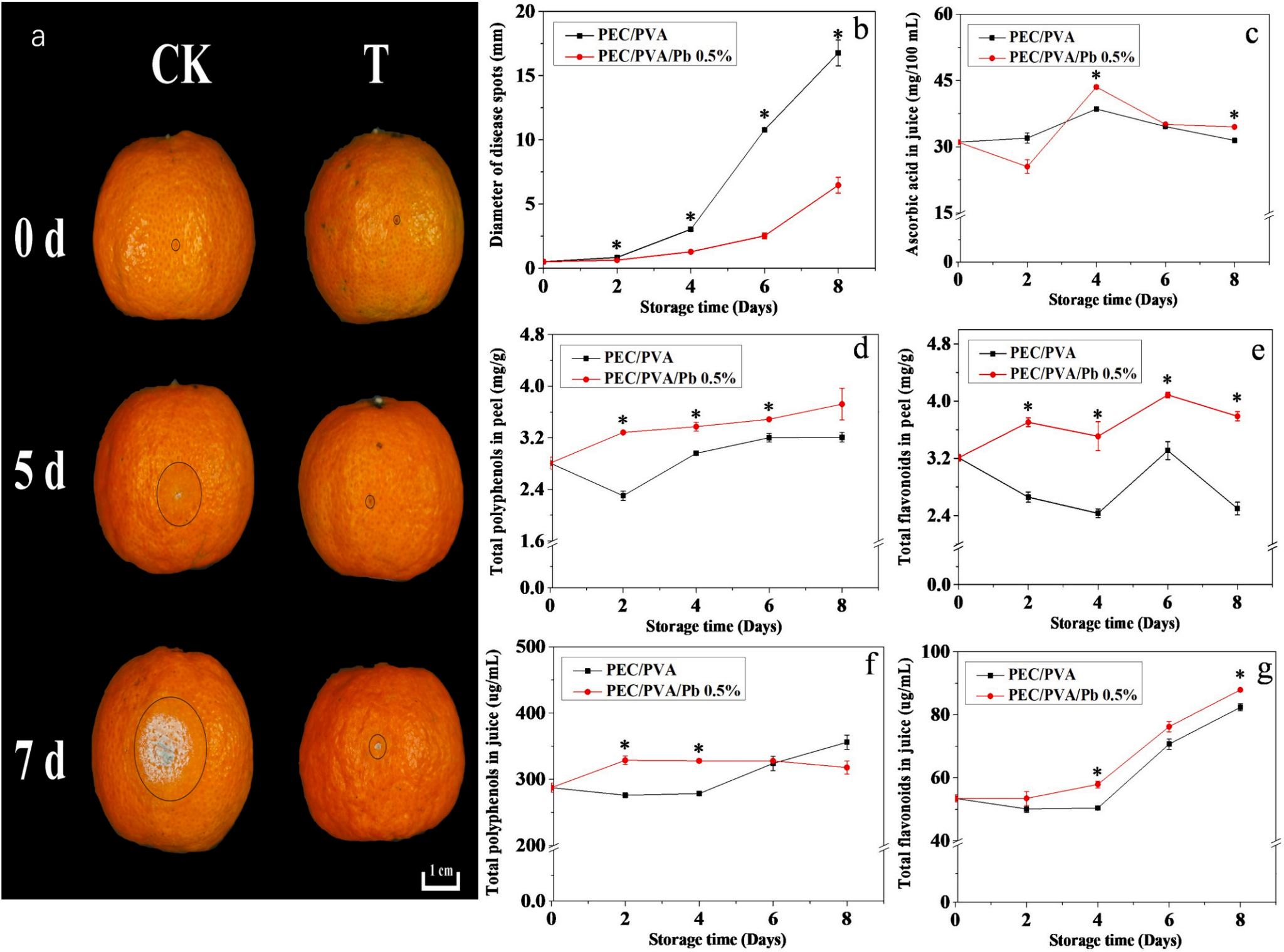 柑橘采后易受青霉菌等侵染导致腐烂,最高超过30%,造成巨大经济损失。传统方法使用2,4-D和咪鲜胺等化学杀菌保鲜剂采后浸果保鲜。但随着消费者对食品安全的需求提高,传统化学保鲜剂越来越受到质疑和挑战。此外,传统塑料薄膜包装已成为一个日益严重的生态环境问题,环境友好型和生物可降解的抗菌薄膜包装日益受到产业界的重视和消费者的青睐。本研究使用柑橘果胶(PEC)、聚乙烯醇(PVA)和聚氨丙基双胍(Pd)为主要成分,通过流延和溶剂蒸发法制备了可生物降解的功能保鲜膜。经测试,PEC/PVA/Pb保鲜膜具有良好的抗拉强度和透水、透气性能,对食源性微生物(大肠杆菌和金黄色葡萄球菌)及柑橘采后致病菌(意大利青霉菌和镰孢菌)等具有显著的抑菌活性。沙糖桔、大雅柑接种青霉菌后,用PEC/PVA/Pb保鲜膜包裹能显著降低果实病斑直径及病情指数,具有较好的防腐保鲜效果。本研究为柑橘采后保鲜领域提供了一种新的保鲜减损材料,为减少化学保鲜剂的使用提供了新的途径。