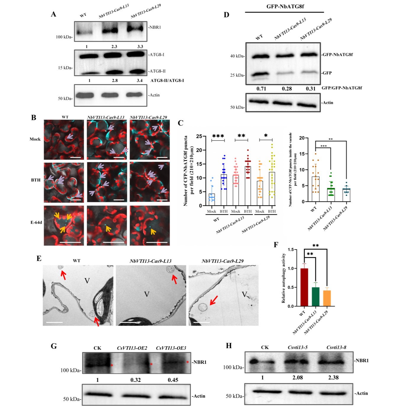 在柑橘中过表达CsVTI13降低了CLas含量,而在本氏烟中敲除NbVTI13则加重其感病症状。分析表明,VTI13属于Qb-SNARE蛋白,并且可定位于自噬体,其敲除植株中存在自噬体与液泡融合缺陷;最后在柑橘中进一步验证,过表达或沉默CsVTI13会相应减少或增加NBR1蛋白水平,表明CsVTI13与NbVTI13均能正调控自噬流和植物免疫(图2)。