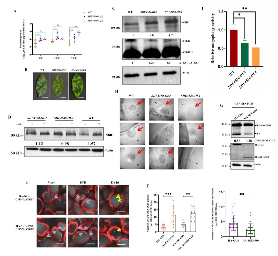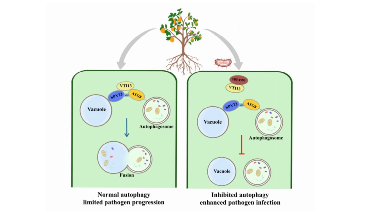 该研究发现,效应蛋白SDE4580的表达不仅增加了CLas的滴度,并且促进了其症状发展。分别在本氏烟和柑橘中检测表达SDE4580后植株的自噬水平,发现其可抑制自噬体-液泡的融合过程。进一步解析SDE4580干扰自噬的机制,通过互作筛选发现其与一个SNARE蛋白CsVTI13互作(图1)。