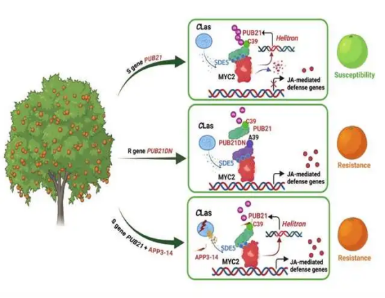 柑橘黄龙病素有“柑橘癌症”之称,在全球众多柑橘产区肆虐横行,每年造成的经济损失超百亿美元之巨。我所周常勇、王雪峰研究员率领团队,在两期国家重点研发计划项目支持下,协同中国科学院微生物所等单位,在国际上首次成功鉴定出柑橘黄龙病的关键抗病基因MYC2与PUB21DN,为黄龙病抗耐新种质的创制提供了全新靶标——这一突破性成果,更为全球柑橘产业注入了崭新希望。
