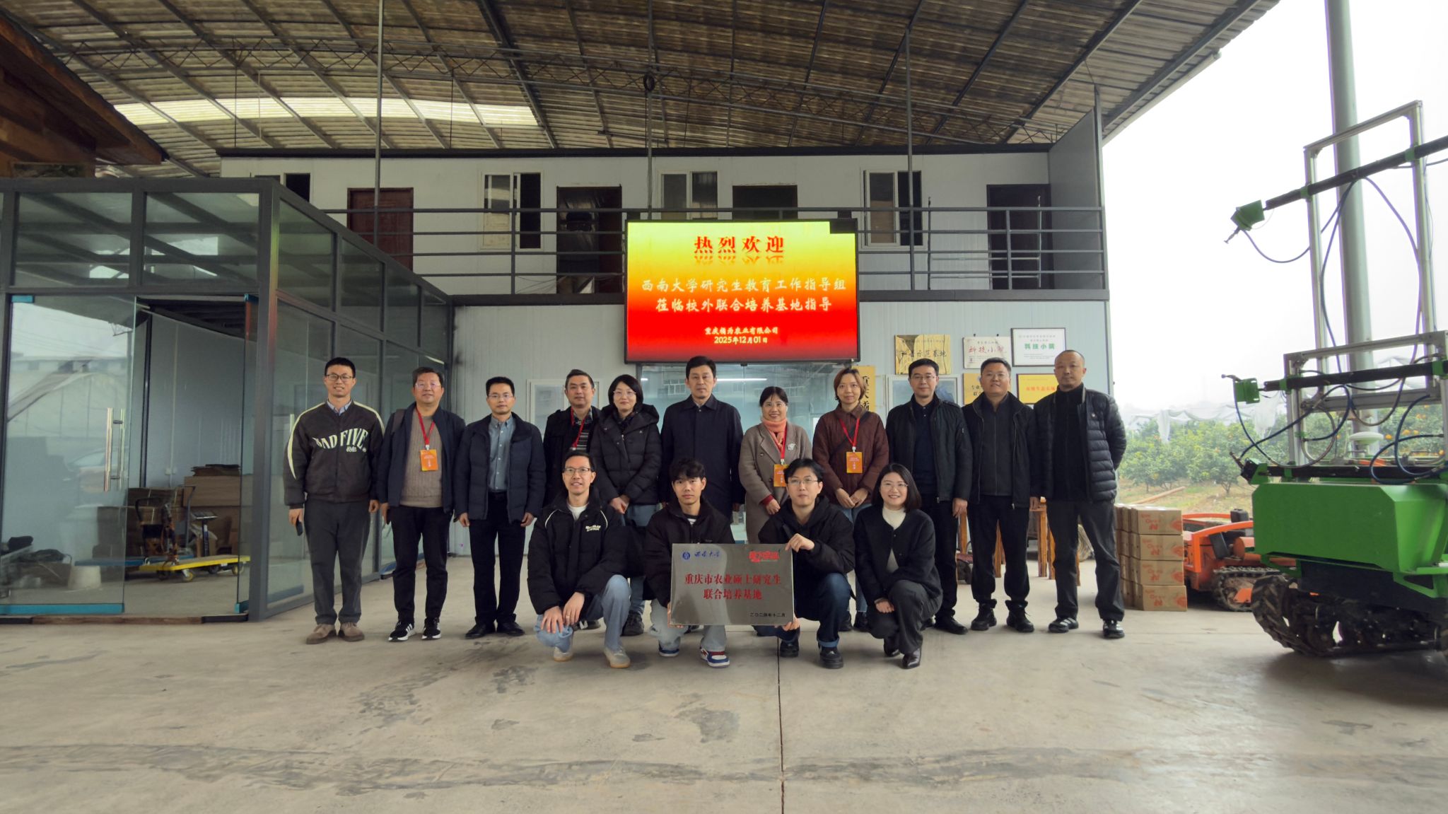 汇报结束后,专家组实地考察了基地的基础设施、配套实验设施、果灵智能化农机装备应用场景及研究生实践教学环境。期间,专家组与正在基地开展专业实践的研究生亲切交流,详细询问其试验方案设计、技术应用难点及成果转化预期,鼓励研究生“将论文写在田间地头,用技术服务产业发展”。督导检查尾声,best365英国体育在线正式为重庆橘为农业有限公司授予“重庆市农业硕士研究生联合培养基地”称号。