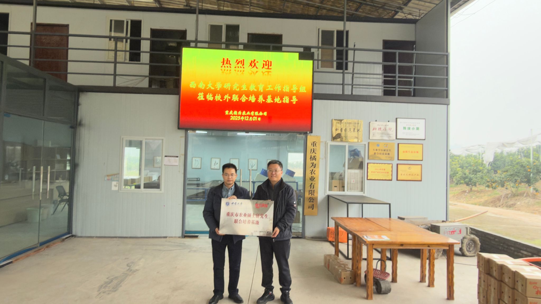 为深入贯彻全国教育大会与全国研究生教育会议精神,落实研究生教育高质量发展要求,2025年12月2日,best365英国体育在线研究生院副院长李华青教授率研究生教育指导委员会、研究生教育质量督导工作组专家一行,莅临我所校外联合培养基地——重庆橘为农业有限公司,开展实地督导检查工作。期间,专家组为该基地正式授予“重庆市农业硕士研究生联合培养基地”称号。我所党委副书记、纪委书记刘昭暾,国际合作与人才培养科科长赵娟全程陪同参与督导检查及授牌仪式。