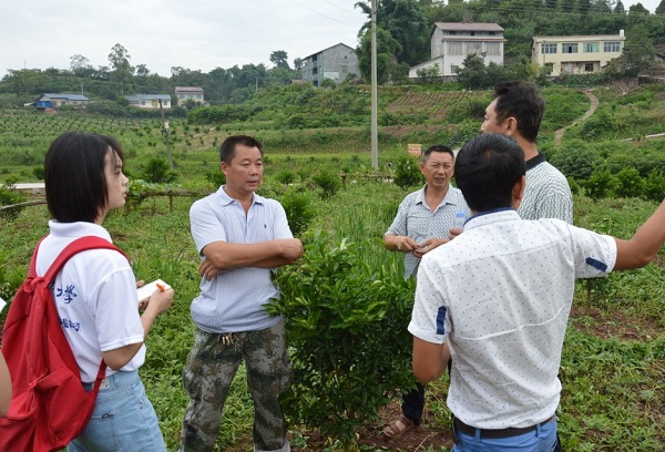 上午9时,王日葵老师带领的实践小组率先到达武胜县新学乡,就不同管理水平的柑橘果园存在的问题进行交流。随行的王朝勇站长表示,不同的柑橘果园进行对比,更能真实地反映出业主们在管理果园中存在的问题。”在随后调研的万隆镇、万善镇以及宝箴塞镇的柑橘基地中,考察小组发现尽管业主们对果园的打理效果有很大差异,但在诸如栽培、施肥等方面的问题都有自己的独到见解,同时也表达了对专业技术的渴望。针对这些问题,王朝勇站长和王日葵老师为业主们提出一些合理的技术指导措施,比如保证果树得到充分的营养,及时施肥以保证微量元素充足,以及适宜修剪幼树,使其主干主枝明显,形成良好的树冠,以确保成熟的果树挂果产量高,并达到较好的品质;另外,在易时来老师带领的小组进行考察指导期间,组员陈细羽针对柑橘产业目前存在的情况和问题对华封镇扶手岩村李常林业主进行了主访。李常林业主表示自己种植柑橘以来得到了政府的大力支持支持,但由于规模扩大使得对种植技术的要求越来越高,因此自己还需要去学习更多的与柑橘种植销售相关的知识,并与其他业主进行交流总结经验。同时他也表达了对实地考察帮扶专家的感谢,并坚信柑橘产业的发展最终能带动整个村的经济收益。