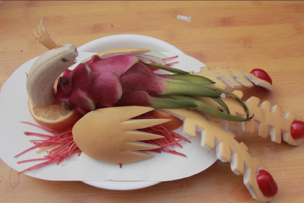 在制作过程中,现场气氛十分活跃,参赛选手尽显精湛手艺。他们团结协作,充分发挥想象力和创造力,根据分发的水果进行拼接、雕刻,色泽鲜亮的水果经他们的巧妙打造之后成了一件件赏心悦目、栩栩如生的水果拼盘。有恢弘大气的“中国地图”,有活灵活现的“龙飞凤舞”,还有新颖独特的“中国新四大发明”。鲜明的色彩、独特的创意给大家展现了一个五彩缤纷的水果世界。