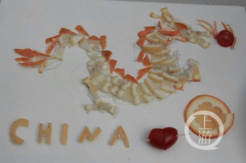 “你好,新中国”是由文学院的两名同学合力完成的作品。她们用桔子的皮和叶拼出单词“hello”,用果肉摆出朝阳和小花。“我们想传达一种清新和朝气的感觉。这个作品寓意着如今的中国迎着朝阳,伴着花香,迈进了新时代,在向全世界说‘你好,我们来了!’。”其中一名参赛者袁同学说。