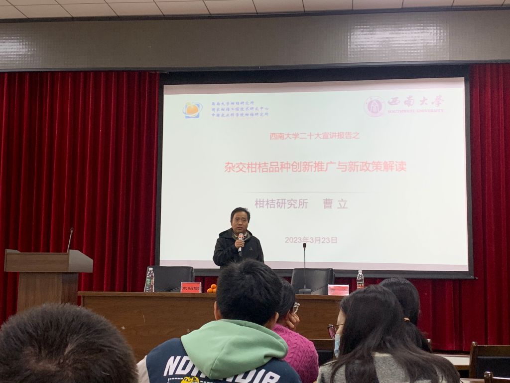在第二阶段,所党委党的二十大精神宣传团专家成员、柑桔研究所育种专家曹立研究员为全体研究生做主题宣讲,主要围绕在党的二十大召开后的新形势下杂交柑橘品种的创新推广与新政策解读。