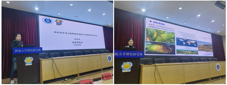 在随后的学术报告环节,刘学东副教授以“纳米技术用于植物基因功能学与植物病毒学研究”为题,探讨了纳米技术在植物病理学研究中的广阔前景,并指出利用纳米材料介导的体外核酸递送系统为开发新型生物农药提供了新途径。龙琴副研究员则以“柑桔溃疡病基因挖掘和遗传改良”为题,介绍了柑桔溃疡病具有高传染性、难以根治的特点,严重威胁柑橘产业的健康发展。她指出,培育抗病柑桔品种是防控溃疡病的根本途径,并深入解析了溃疡病脓疱形成的调控机制以及柑桔响应溃疡病菌侵染的抗性调控网络。