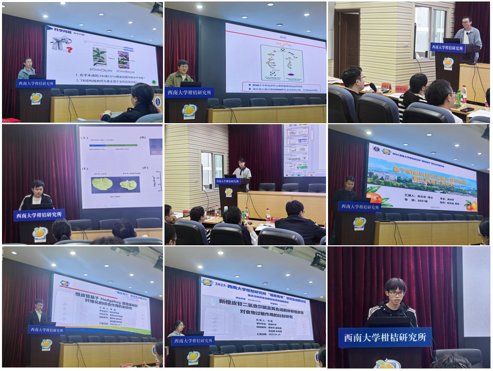 除了两位老师的精彩报告,博士研究生邱远健、崔学进、王甲军、梅亚林、黎思辰、刘文欢,以及硕士研究生刘鑫、马世绵、唐胜共9名同学也分享了他们的研究成果。来自国家柑桔苗木脱毒中心的邱远健以“柑橘裂皮类病毒右手末端区与Virp1蛋白互作影响致病的机制研究”为题,揭示了柑橘裂皮类病毒(CEVd)与寄主Virp1蛋白相互作用影响其致病机制。崔学进详细介绍了毒力因子SDE2470如何抑制CsATG3-CsATG8i相互作用,进而抑制CsATG3-CsATG8i介导的自噬。王甲军则介绍了柑橘黄脉病毒CYVCV的危害症状,并提出ClBeclin1作为抗病枢纽蛋白,通过与ClAPX1互作建立双重防御机制。梅亚林探讨了蛋白酶体亚基RPN13介导黄龙病效应蛋白降解正调控柑橘免疫的分子机制,揭示了RPN13促进效应蛋白SDE5640通过26S蛋白酶体途径降解的机制,以及SDE5640与RPN13互作抑制病原菌侵染的过程。马世绵以“黄龙病菌效应蛋白SDE2470靶向谷氧还蛋白C9抑制植物免疫的分子机制”为题,揭示了柑桔“癌症”——黄龙病病菌的效应蛋白SDE2470如何靶向CsGRXC9蛋白抑制植物免疫反应。来自柑桔病虫害绿色防控中心的黎思辰针对柑桔害虫之一的柑橘全爪螨进行研究,揭示了螺螨酯作为信号分子,PcHR96h调控的柑橘全爪螨对螺螨酯的代谢抗性机制。来自栽培与智慧化中心的刘文欢则搭建了适合多产区不同生长阶段的柑桔地上部新生器官的图像识别算法,并在智能手机、AI小球机和巡检机器人等平台的测试中,为智能感知算法提供了关键探索和实际参考。来自柑桔加工与品控物流中心的刘鑫比较了新橙皮苷二氢查尔酮(NHDC)及其合成前体新橙皮苷(NH)均可缓解食物过敏的过敏症状,并阐释了柑桔NHDC的抗过敏活性作用机制,揭示了稳定、简单的查尔酮结构可能具有更好的免疫活性。唐胜同学探究了柑桔类黄酮的综合影响,详细介绍了柑桔类黄酮橙皮苷可缓解小鼠肝纤维化、炎症反应、脂质代谢和肠道菌群紊乱。此外,其通过抑制Hedgehog通路,阻断肝星状细胞的分化,减少细胞外基质的沉积。