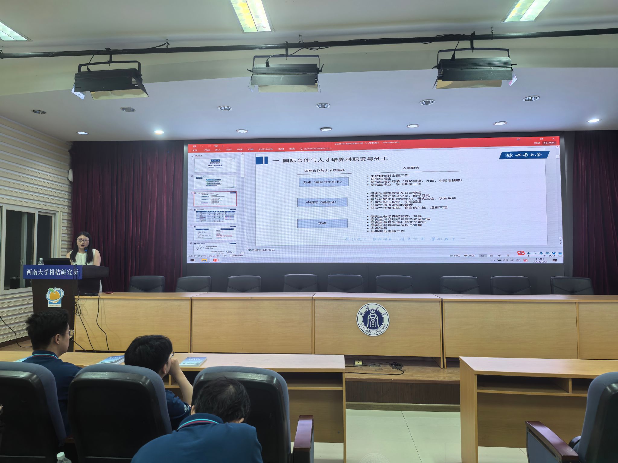 最后,国际合作与人才培养科科长、研究生工作办公室主任赵娟为新生详细讲解了研究生培养流程及管理系统的使用,并带领同学们学习相关管理文件,辅导员曾晓琴介绍了研究生日常管理规章制度与奖助学金政策,帮助同学们快速适应新身份,顺利投入到研究生崭新的学习生活。
